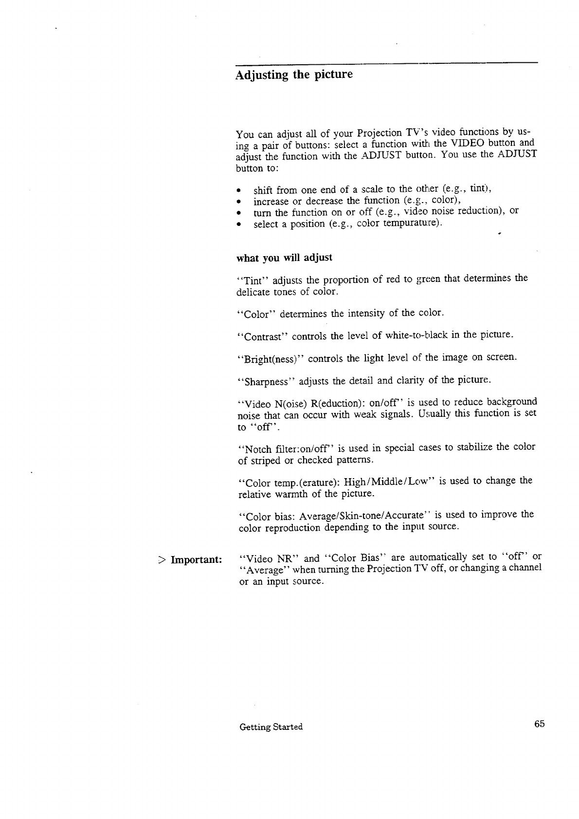 Adjusting the picture .......................................... 65
