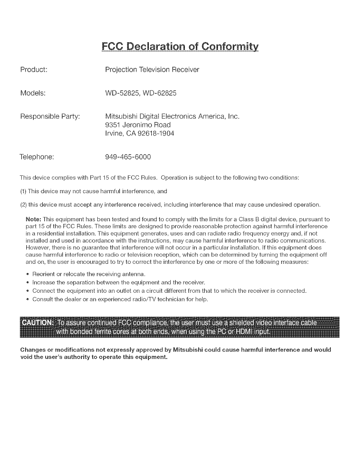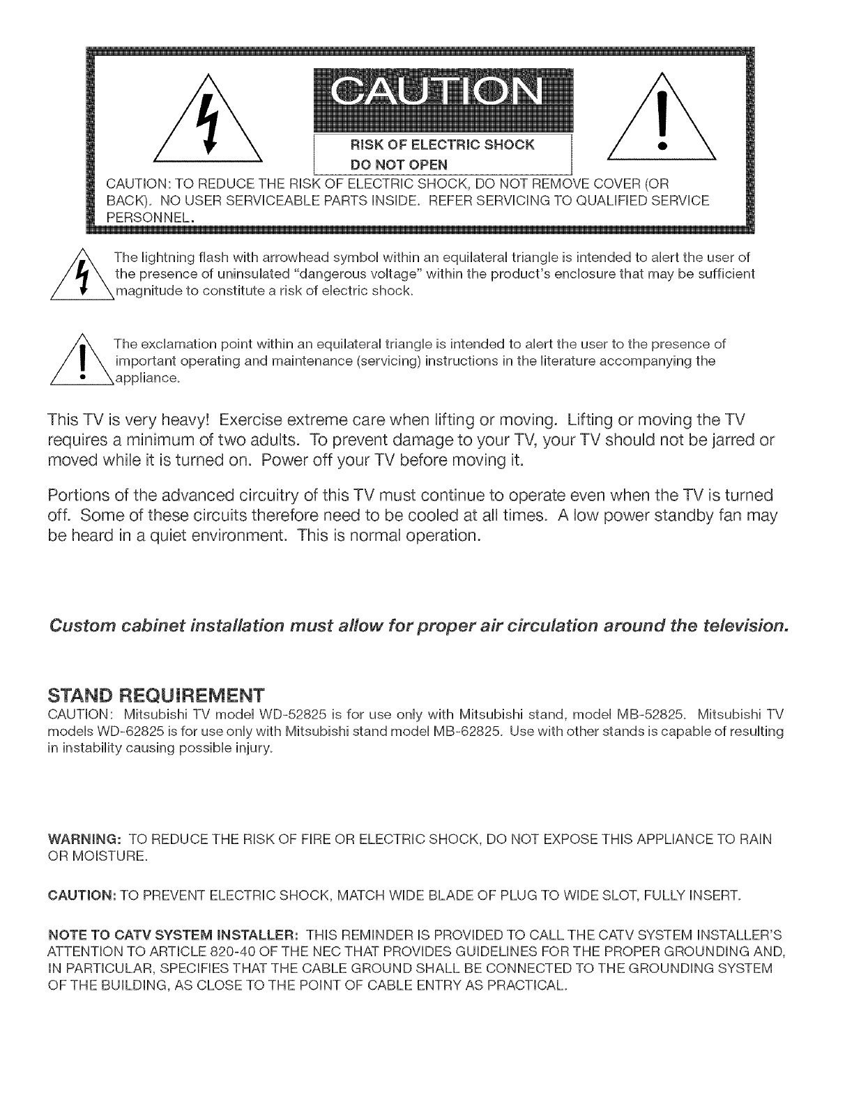 CAUTION: Mitsubishi TV model WD-52825 is for use only with Mitsubishi stand, model MB-52825. Mitsubishi TV