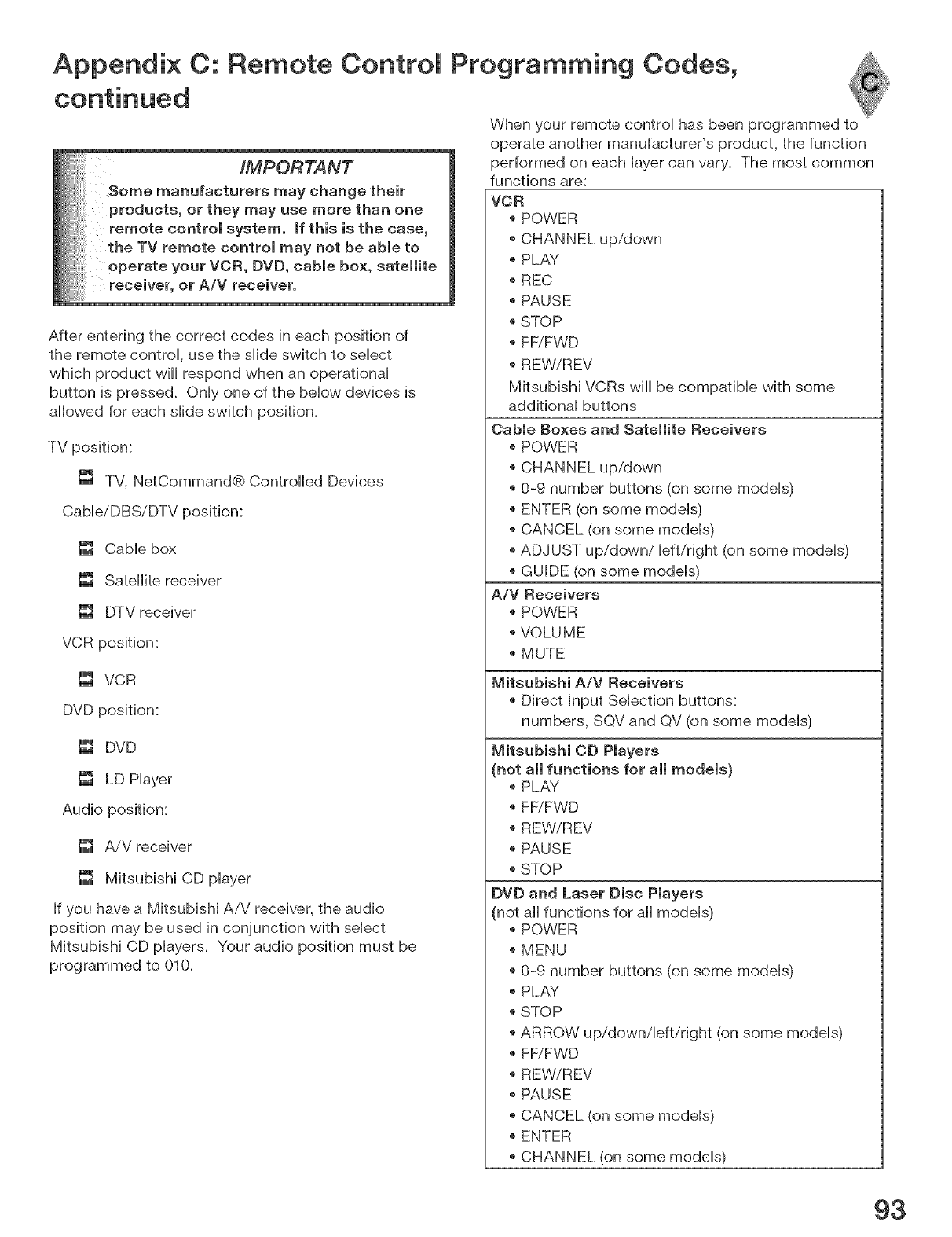 Remote Control Functions: