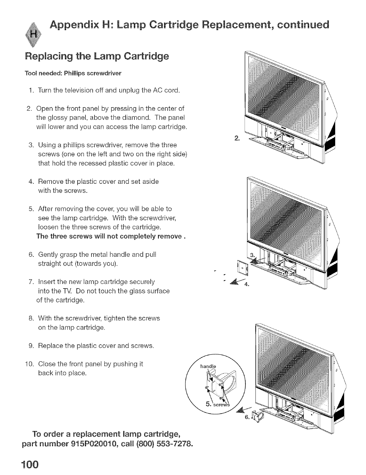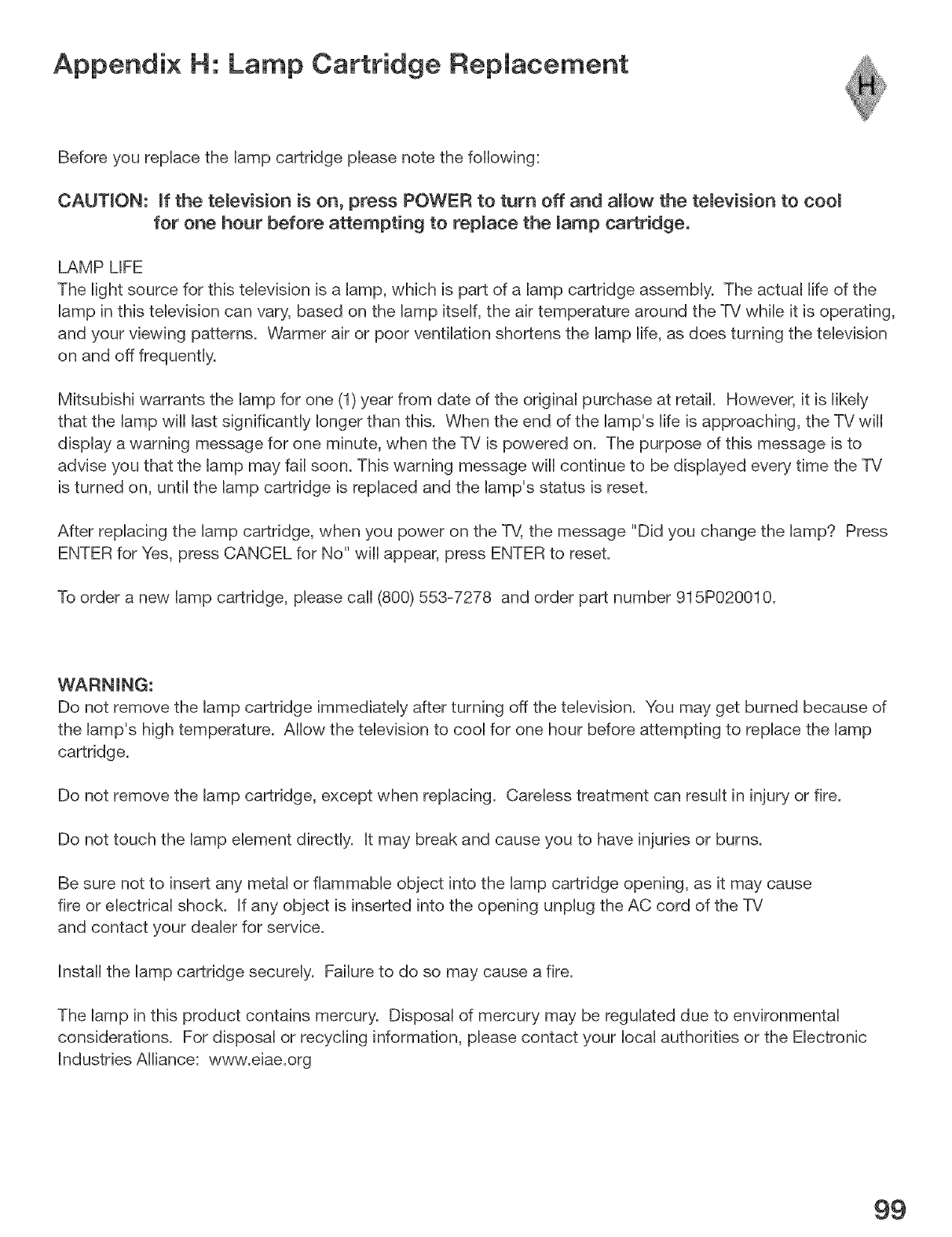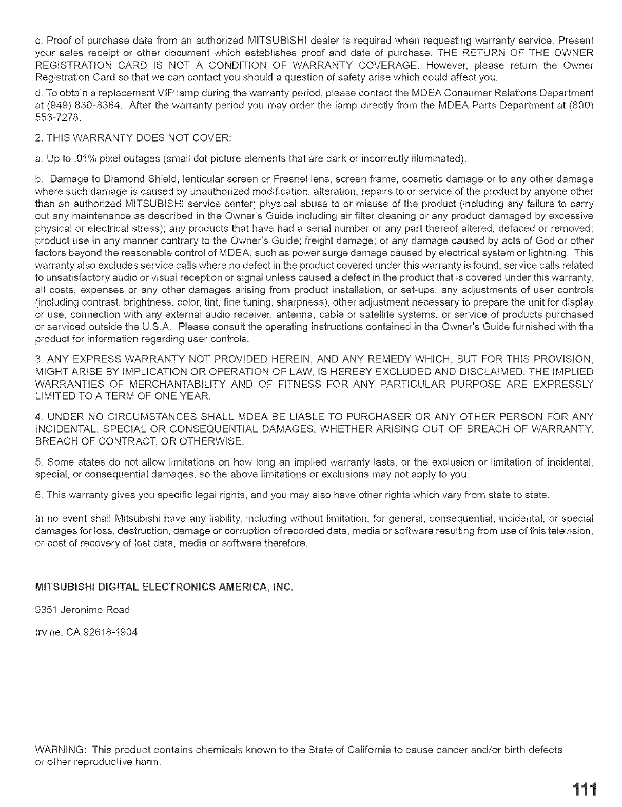 d. To obtain a replacement VlP lamp during the warranty period, please contact the MDEA Consumer Relations Department