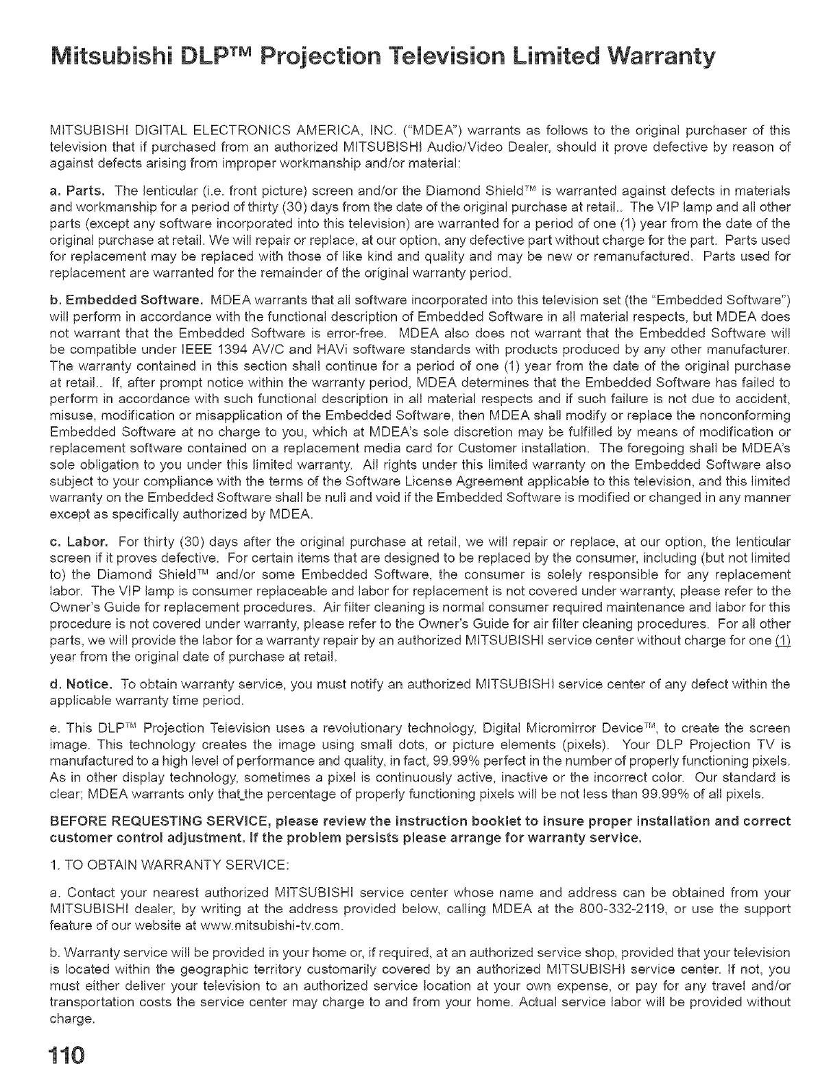 d. Notice. To obtain warranty service, you must notify an authorized MITSUBISHI service center of any defect within the