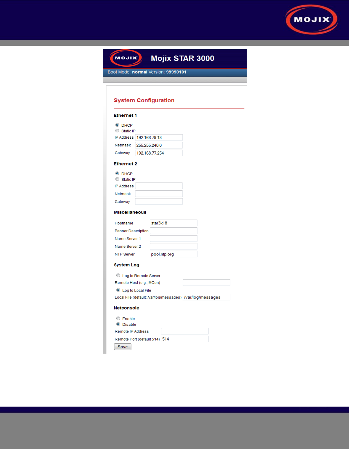 4. Select the desired IP settings for Ethernet 1 and then click save. This will reboot the STAR which will