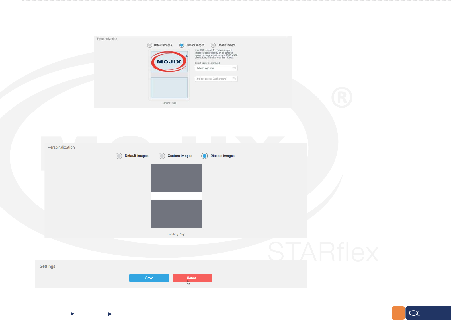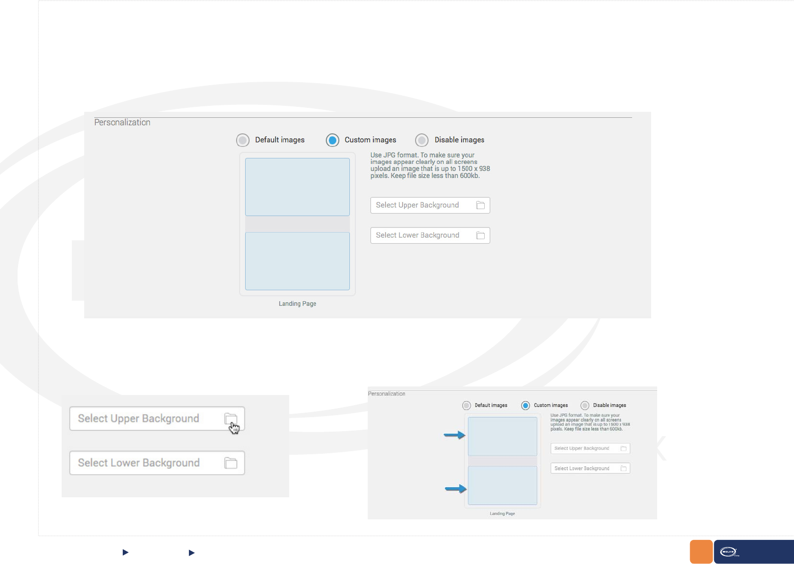 Disable images: Select this option if no images are required to be displayed as upper and lower background. A preview of how the background will look like