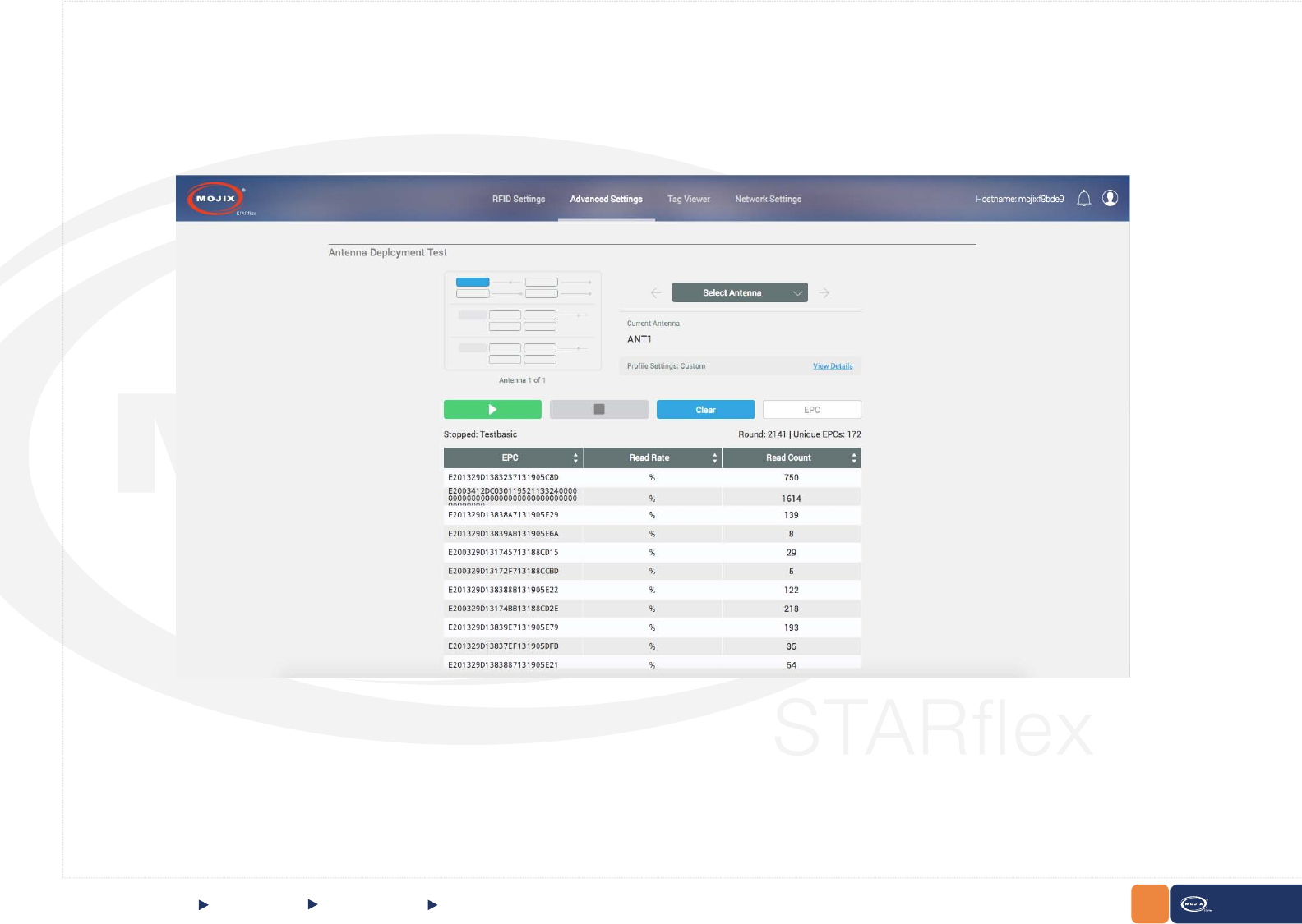 The “Antenna Deployment Test” page allows the user to step through the congured antennas in the basic settings page (refer to Chapter III - RFID Settings)