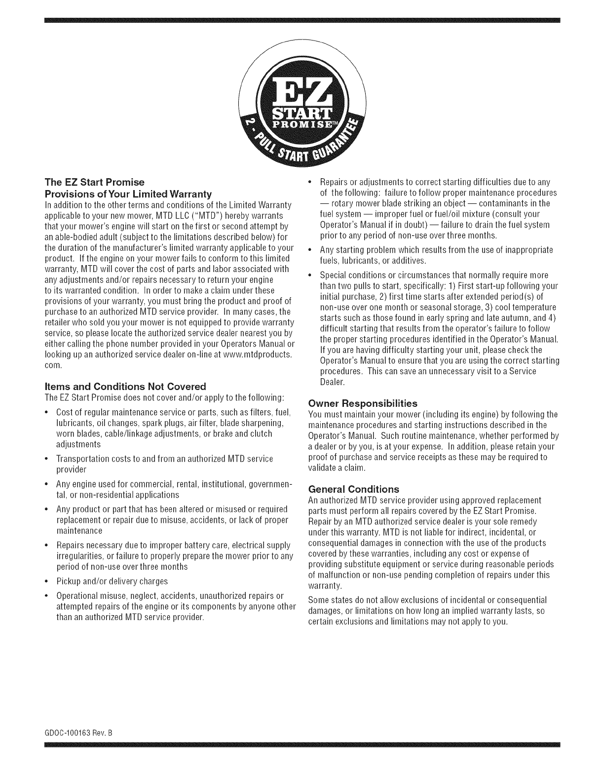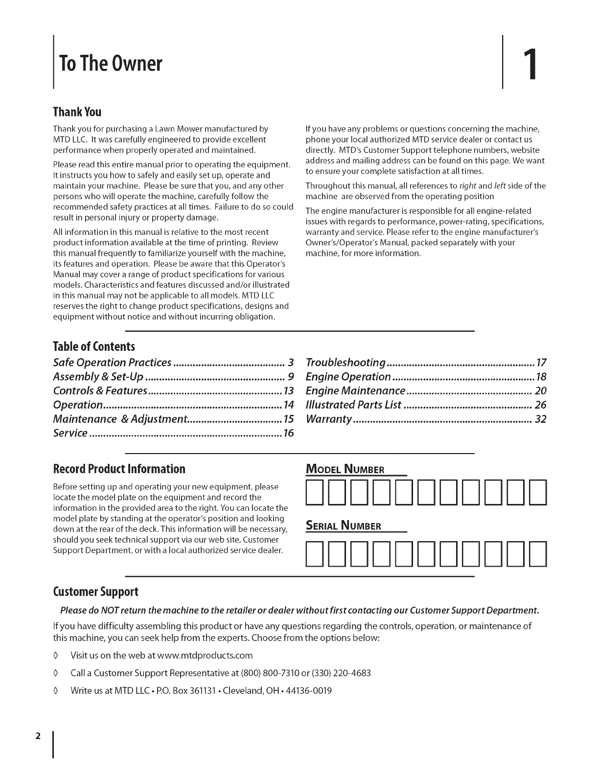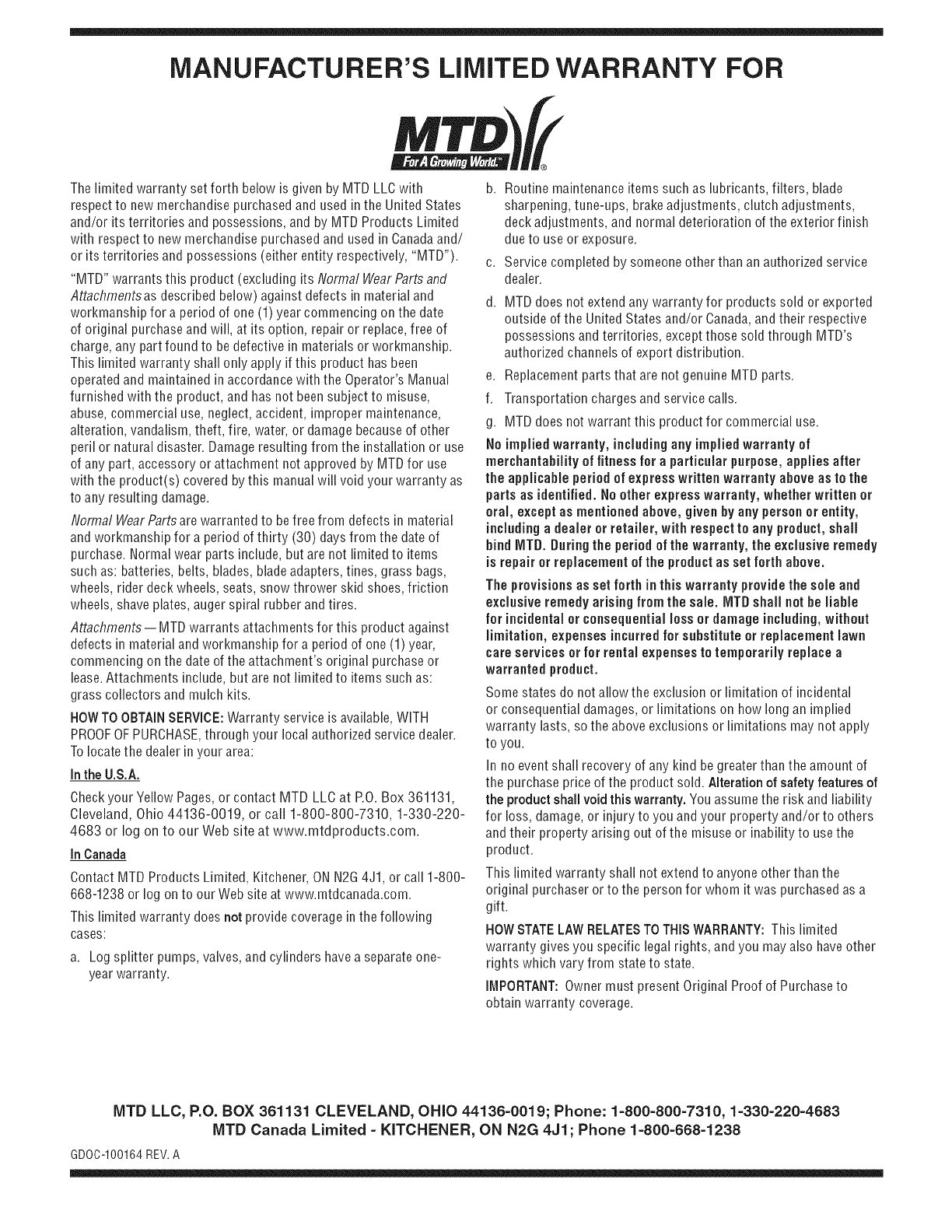 MTD LLC, P.O. BOX 361131 CLEVELAND, OHiO 44136=0019; Phone: 1=800=800=7310, 1=330=220=4683