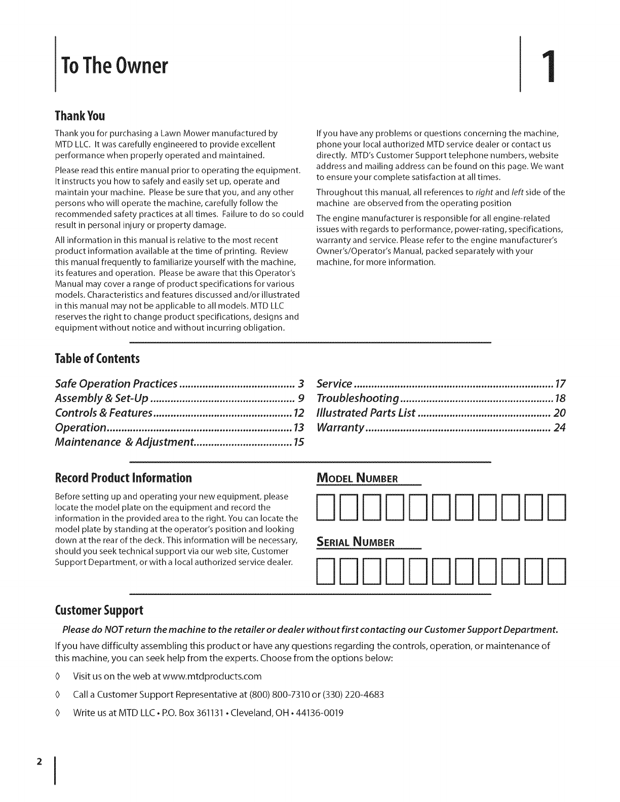 MTD LLC, P.O. BOX 361131 CLEVELAND, OHiO 44136=0019; Phone: 1=800=800=7310, 1=330=220=4683