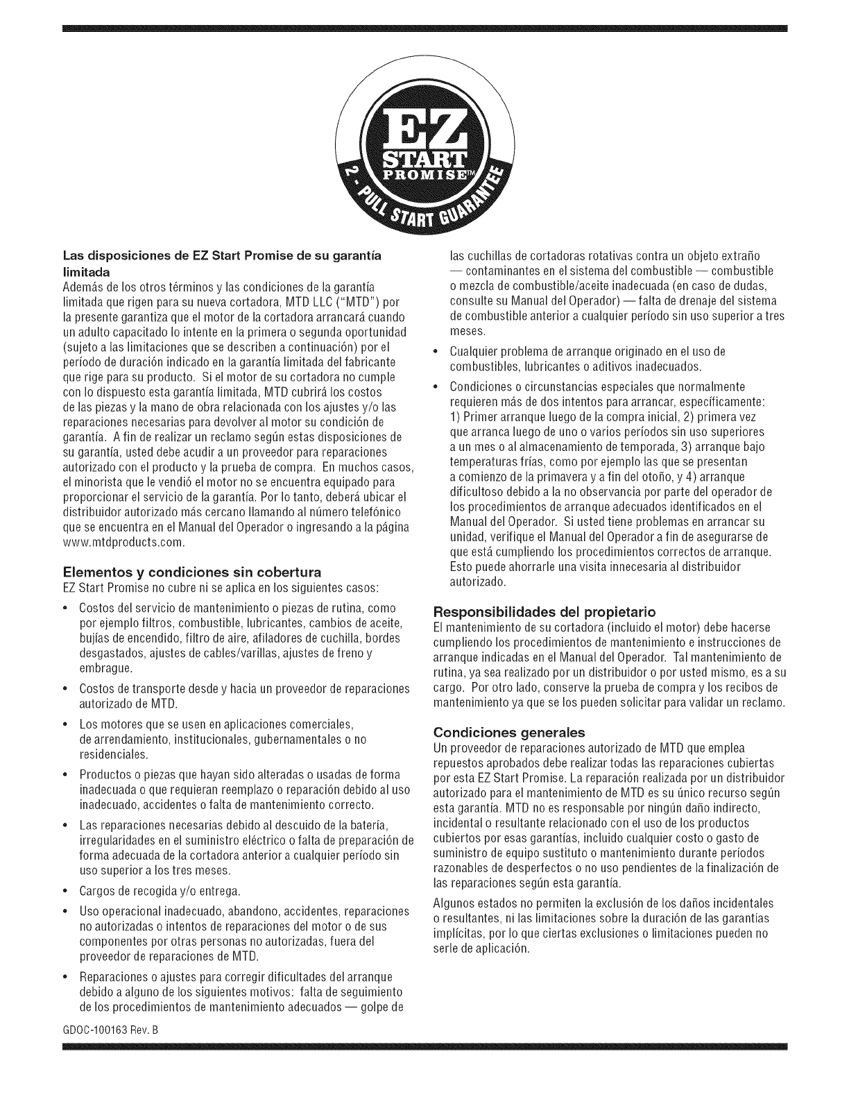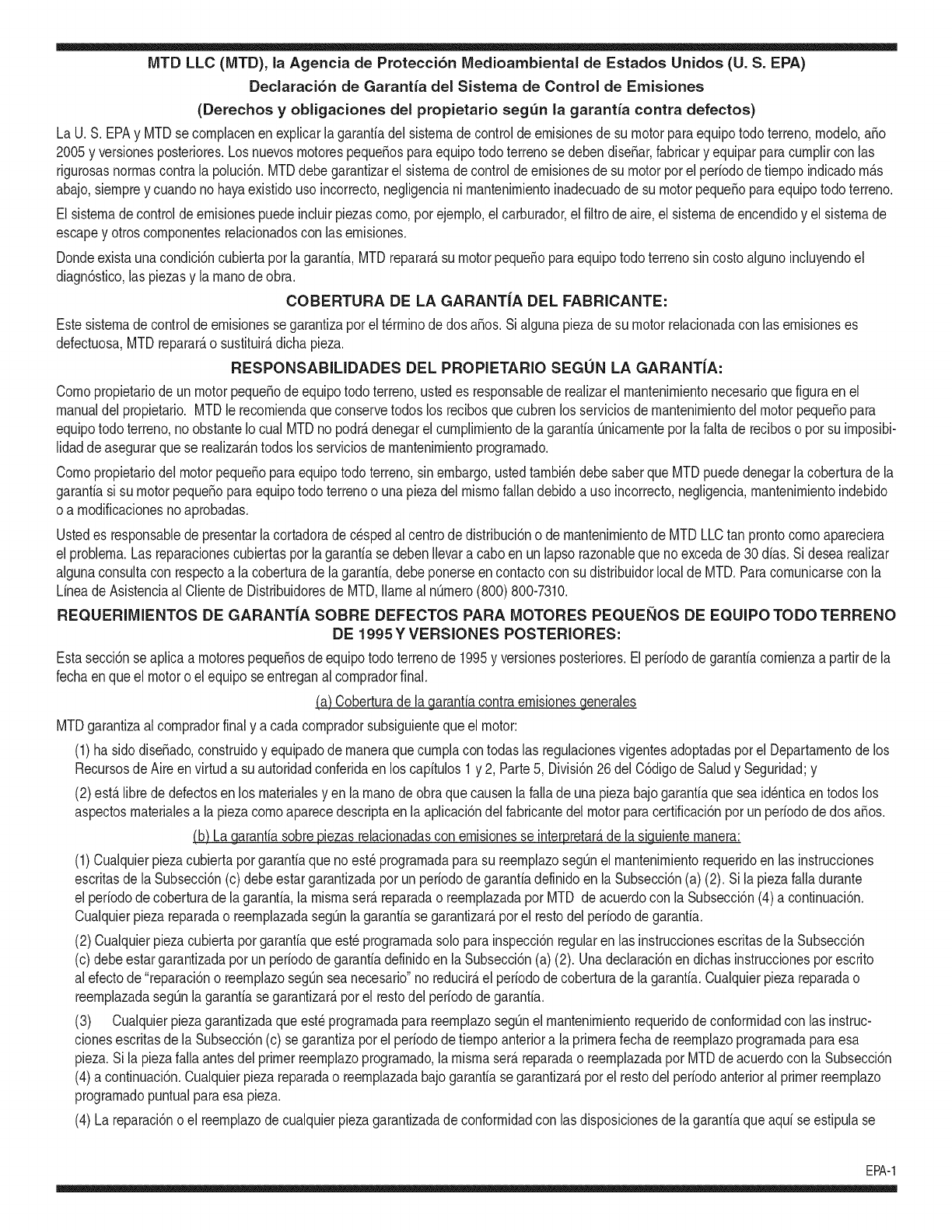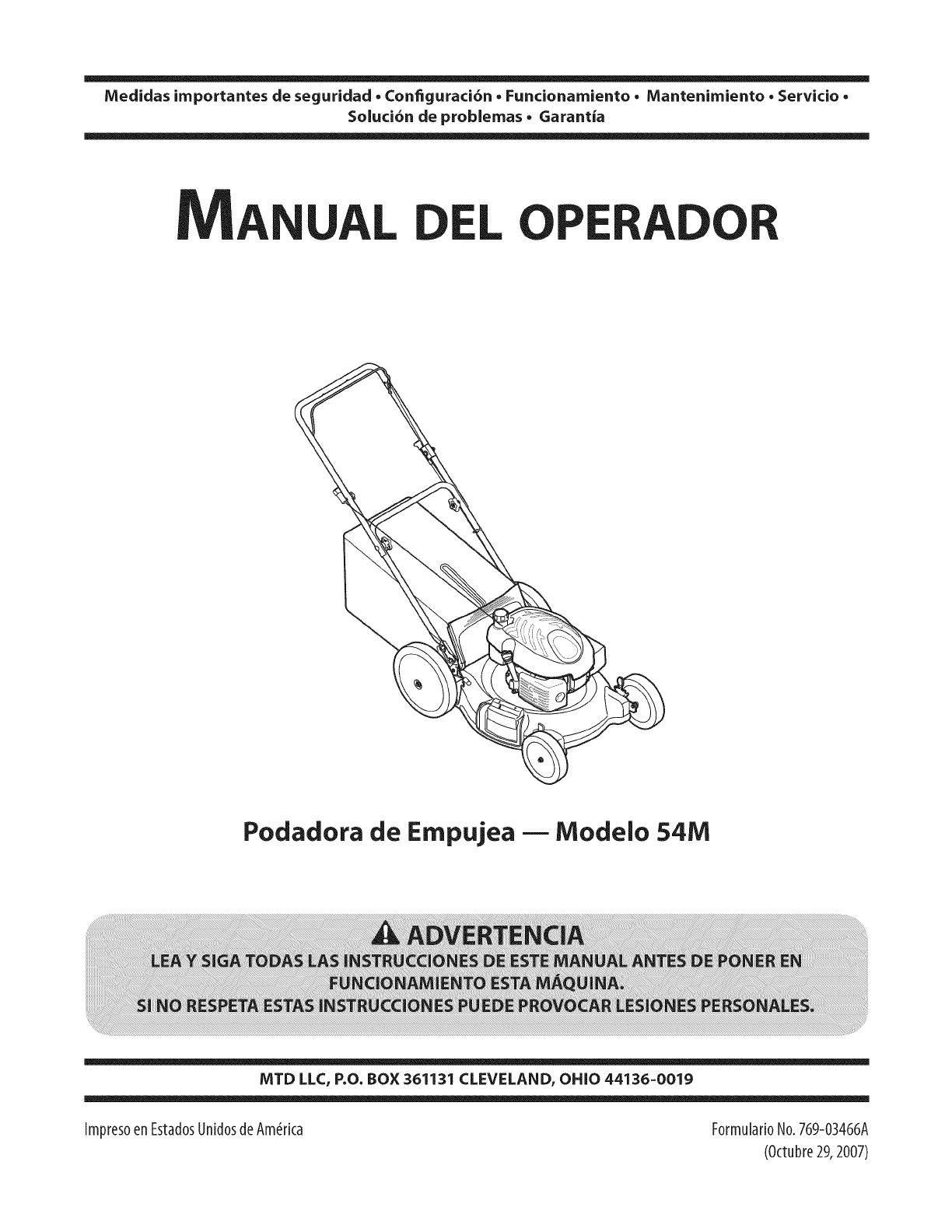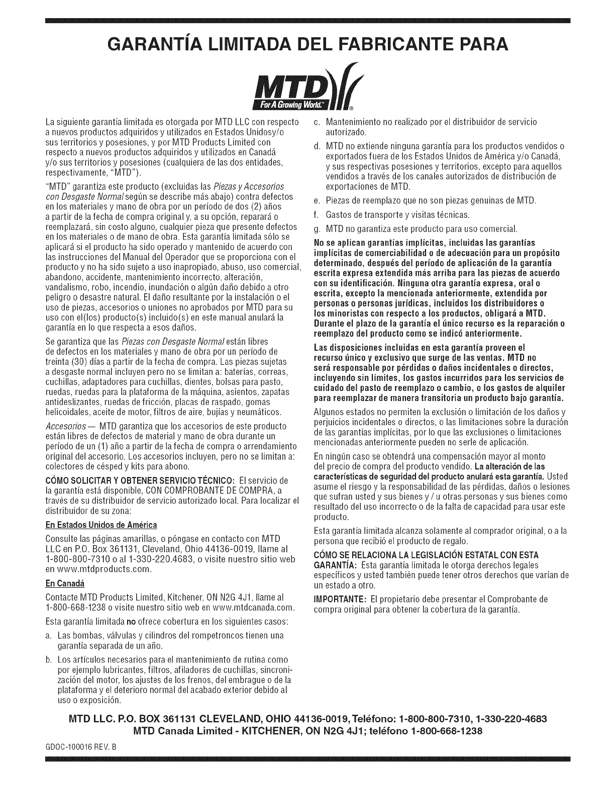 MTD LLC. P.O. BOX 361131 CLEVELAND, OHiO 44136-0019, Tel_fono: 1=800=800=7310, 1=330=220=4683