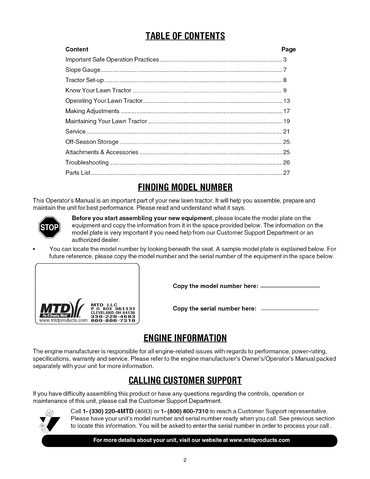 Call 1- (330) 220-4MTD (4683) or 1- (800) 800-7310 to reach a Customer Support representative.