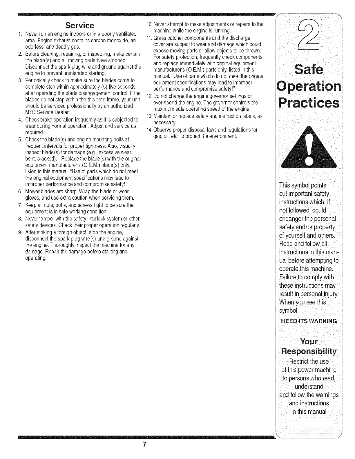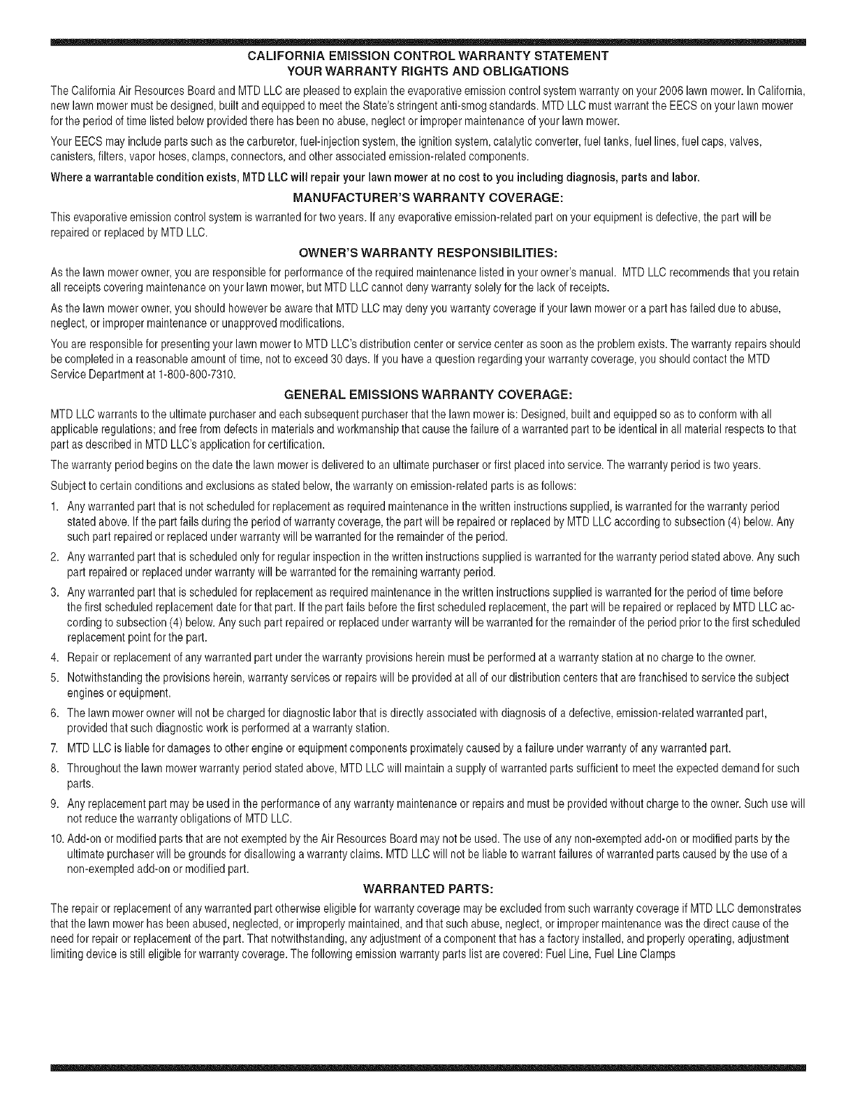 8. Throughoutthe lawnmowerwarrantyperiodstated above,MTDLLC will maintaina supplyof warrantedparts sufficientto meetthe expecteddemandfor such