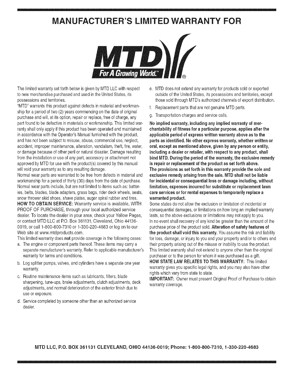 or contact MTD LLC at RO. Box 361131,Cleveland, Ohio 44136-