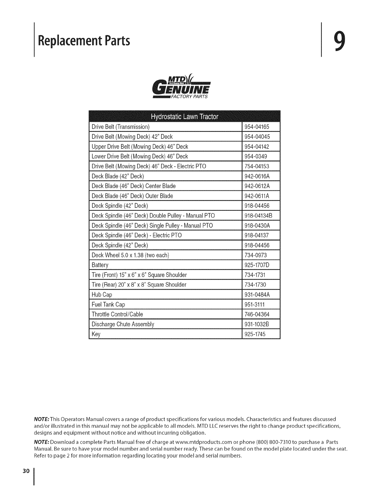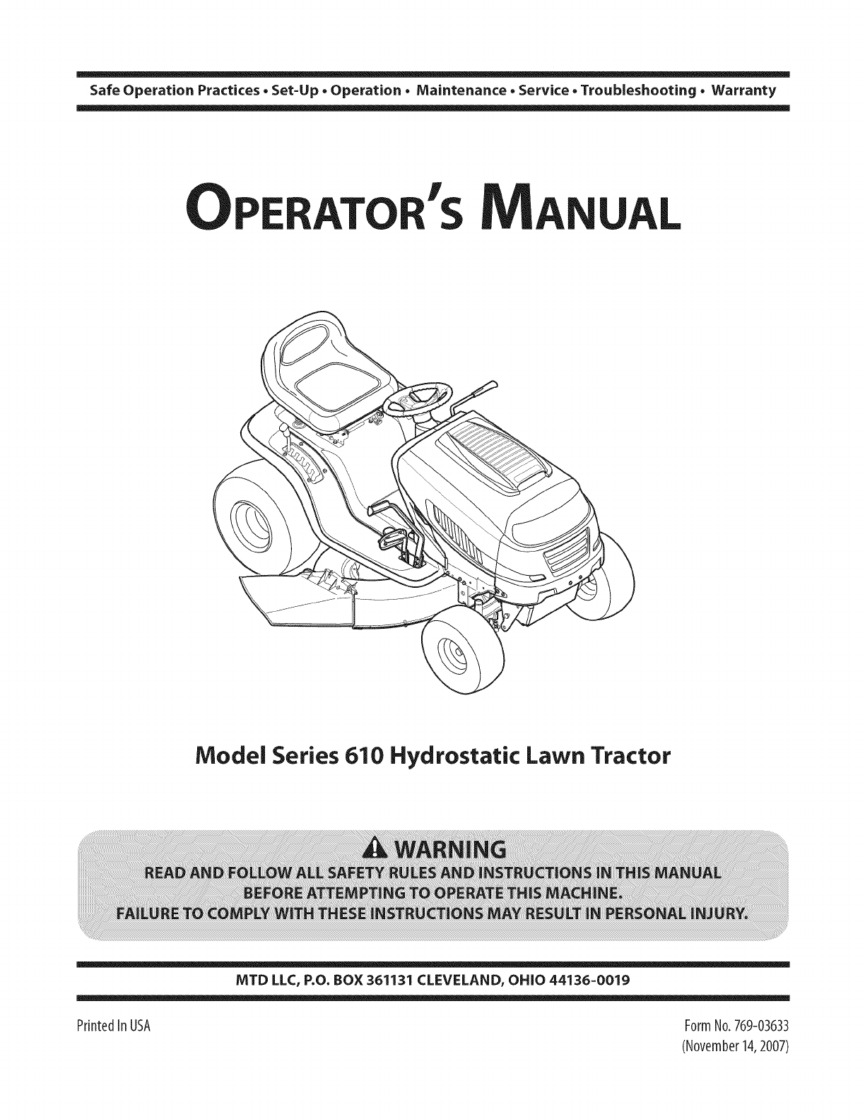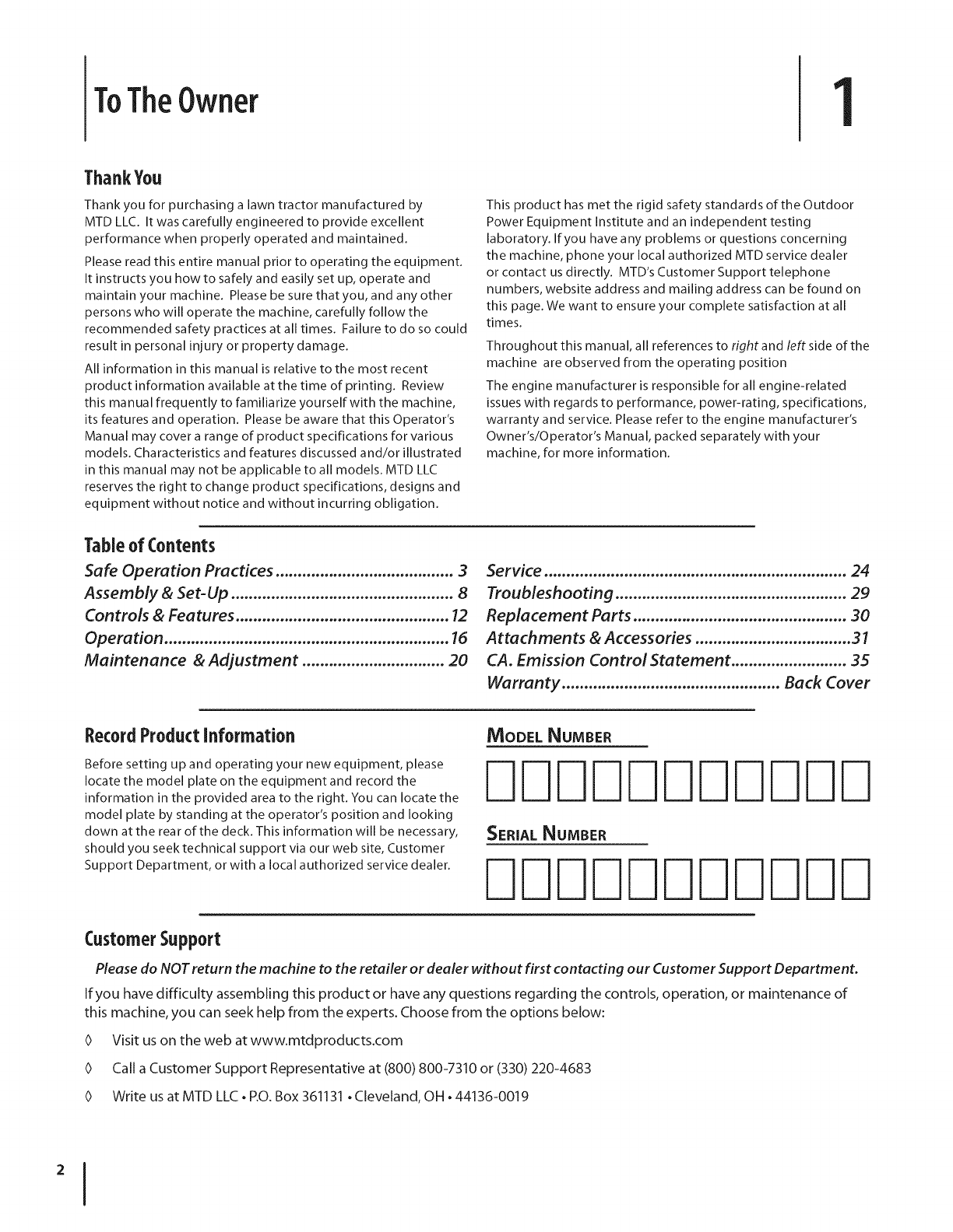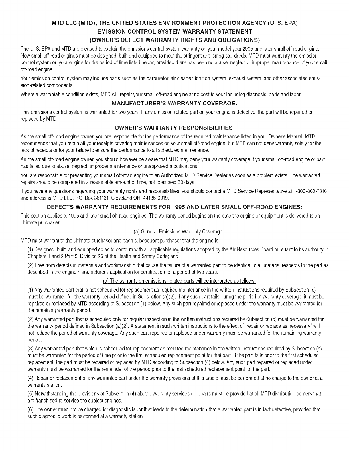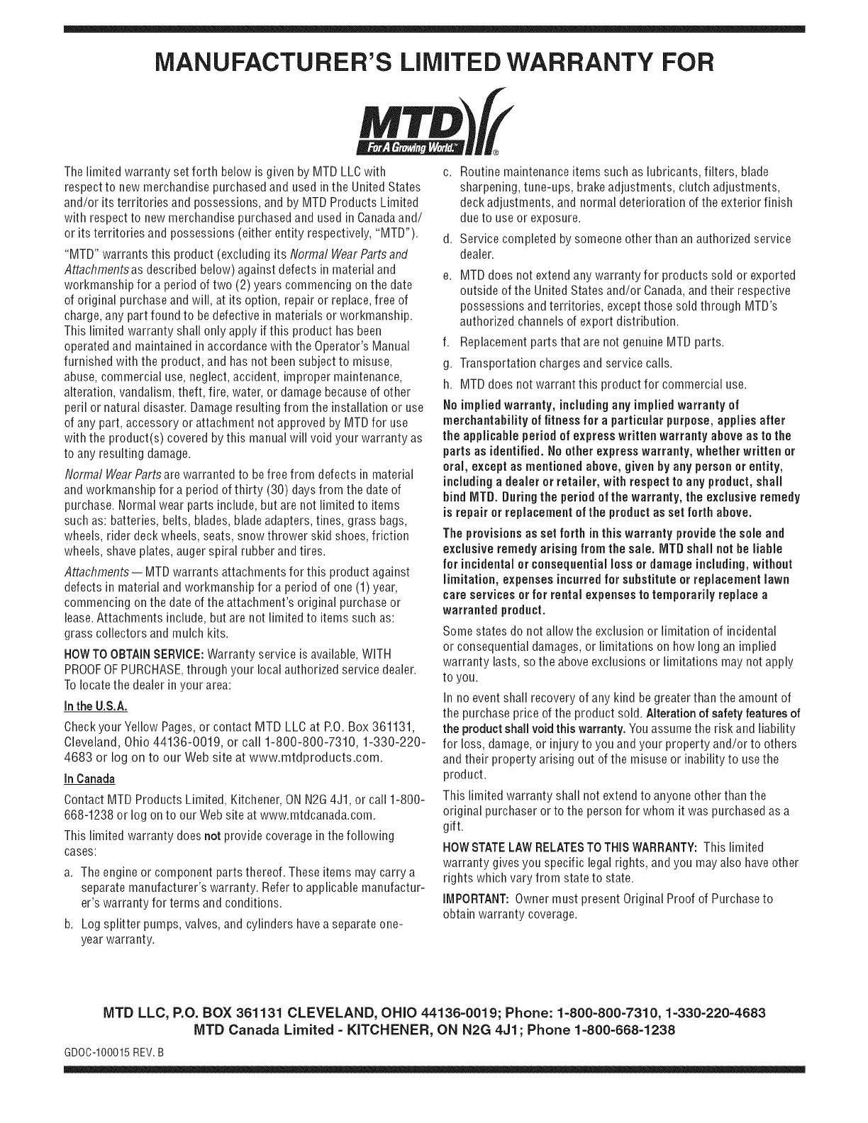 MTD LLC, P.O. BOX 361131 CLEVELAND, OHiO 44136=0019; Phone: 1=800=800=7310, 1=330=220=4683