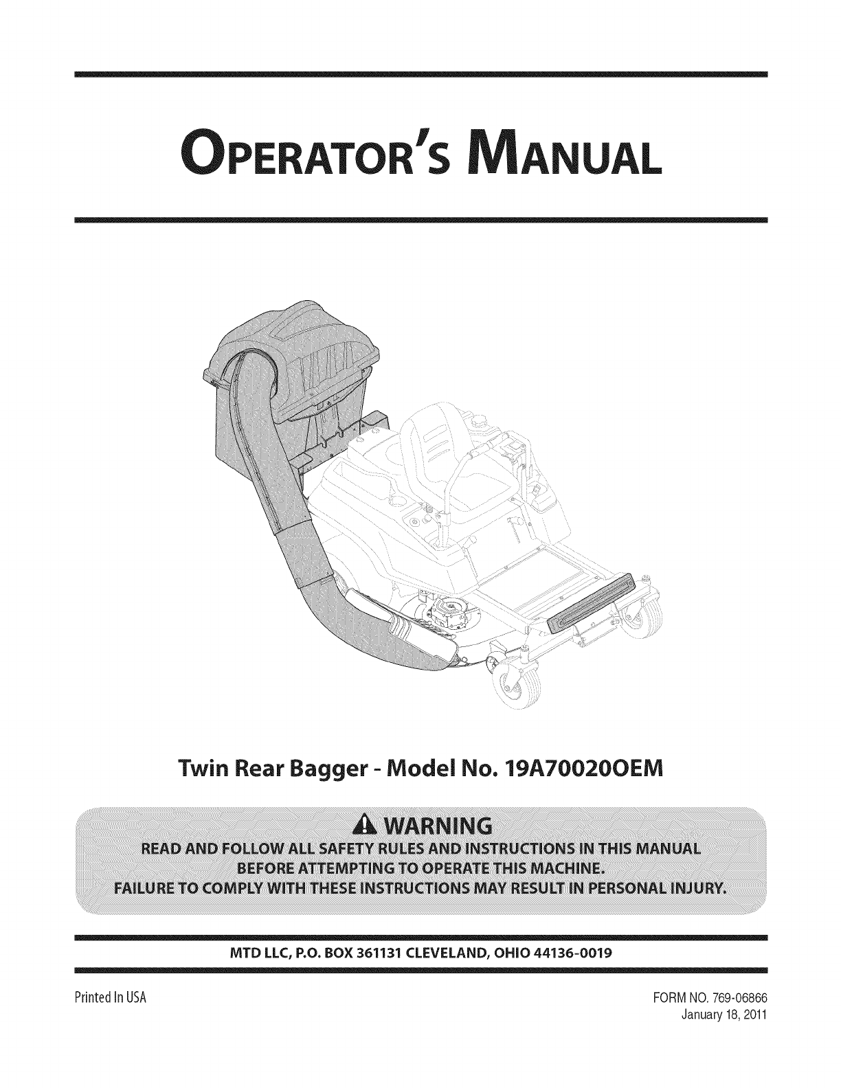 User Manual: MTD 19A70020 19A70020 MTD TWIN REAR BAGGER - Manuals and Guides View the owners manual for your MTD TWIN REAR BAGGER #19A70020. Home:Lawn & Garden Parts:MTD Parts:MTD TWIN REAR BAGGER Manual