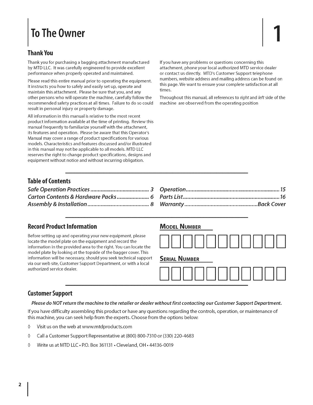 MTD LLC, P.O. BOX 361131 CLEVELAND, OHiO 44136=0019; Phone: 1=800=800=7310, 1=330=220=4683