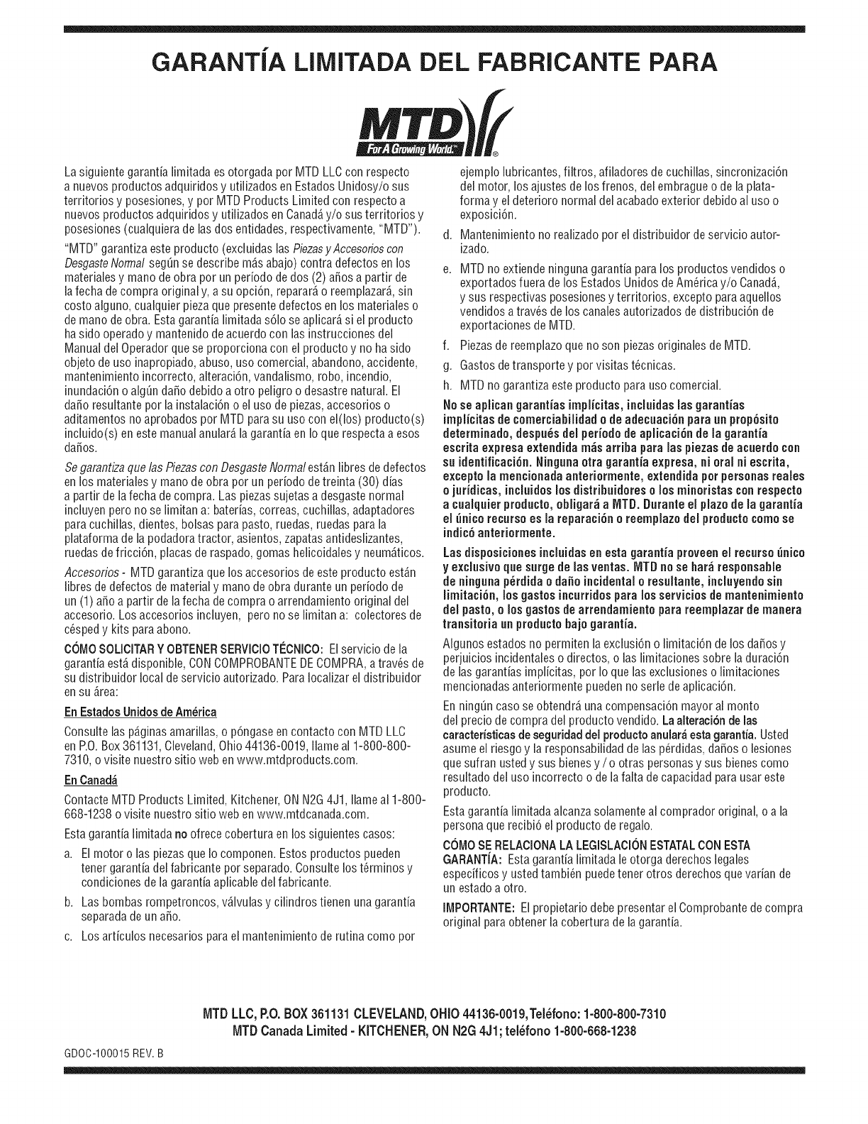 Consulte las pAginasamarillas, o p6ngase en contacto con MTD LLC