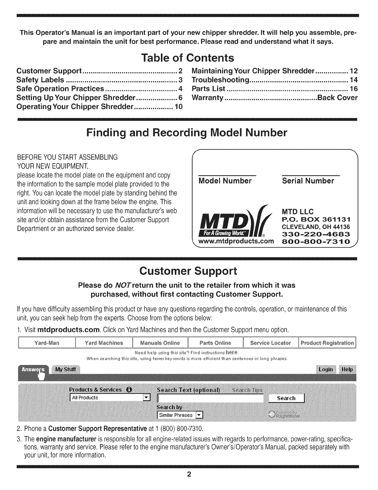 or contact MTD LLC at RO. Box 361131,Cleveland, Ohio 44136-