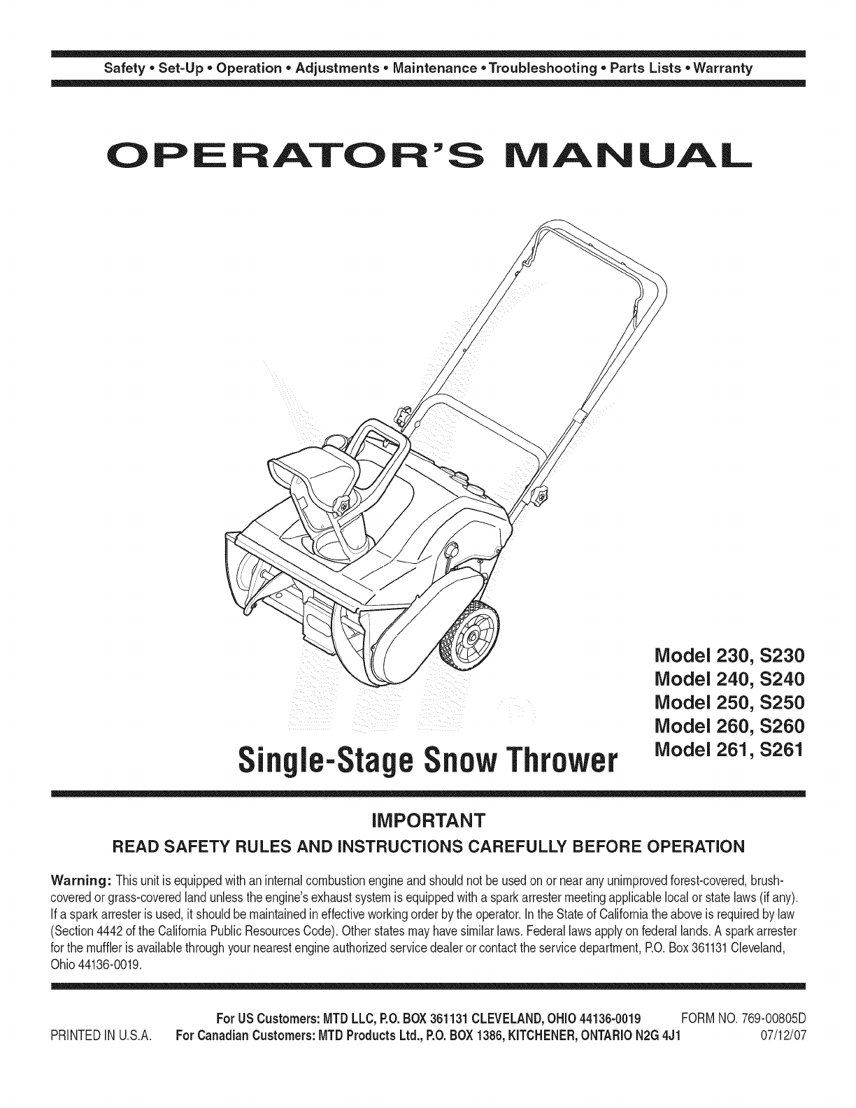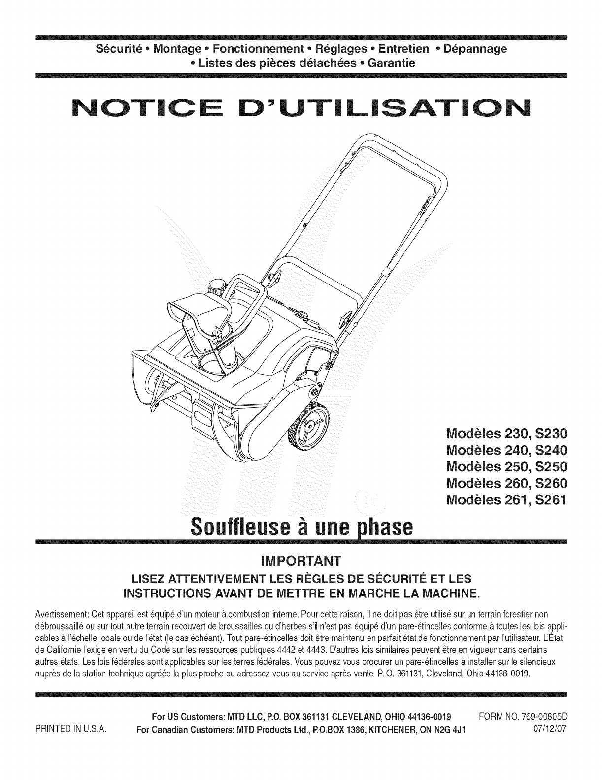 PRINTEDIN U.S.A. For USCustomers: MTDLLC,P.O.BOX361131CLEVELAND,OHIO44136-0019 FORMNO 769-00805D
