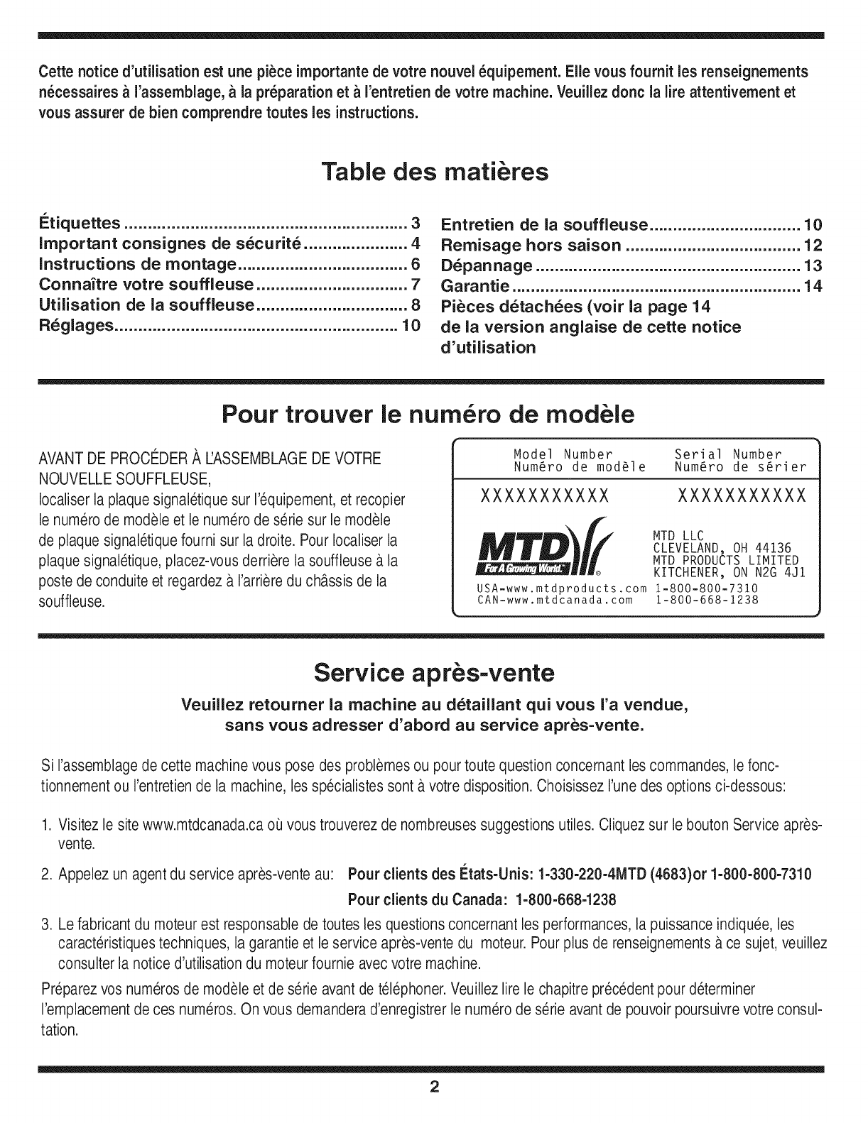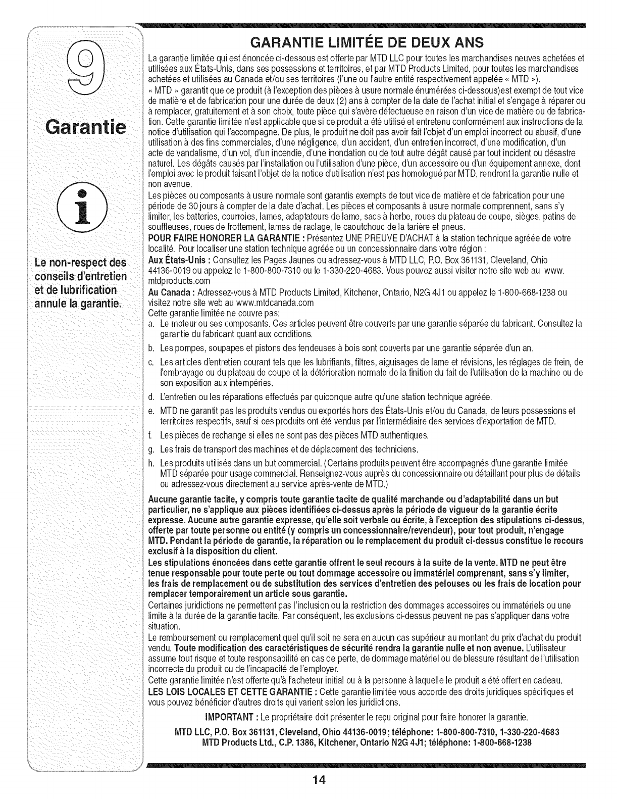 Au Canada: Adressez-vousa.MTDProductsLimited,Kitchener,Ontario,N2G4J1ouappelezle1-800-668-1238ou