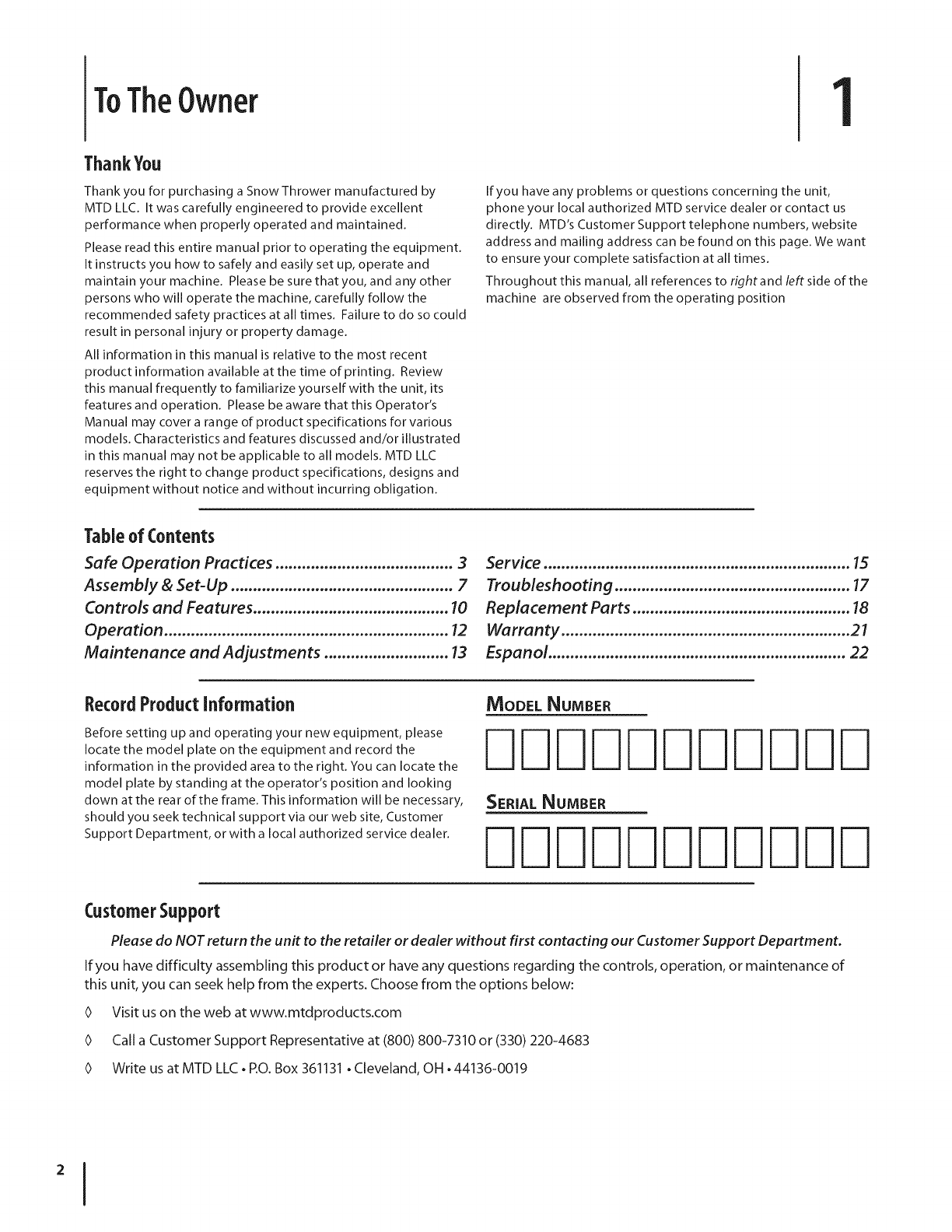 0 Write us at MTD LLC • EO. Box 361131 • Cleveland, OH • 44136-0019
