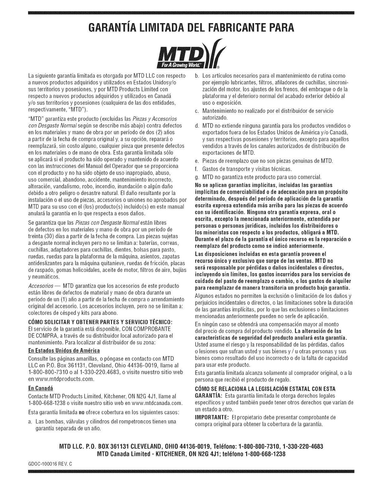 "MTD" garantiza este producto (excluidas las PiezasyAccesorios