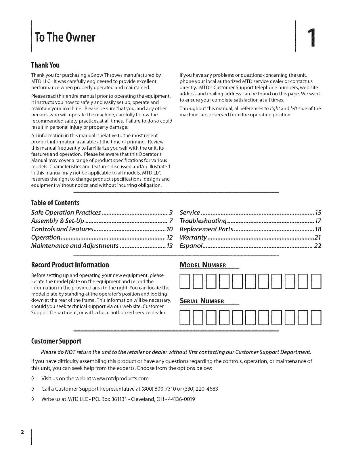 0 Write us at MTD LLC •RO. Box 361131 •Cleveland, OH •44136-0019