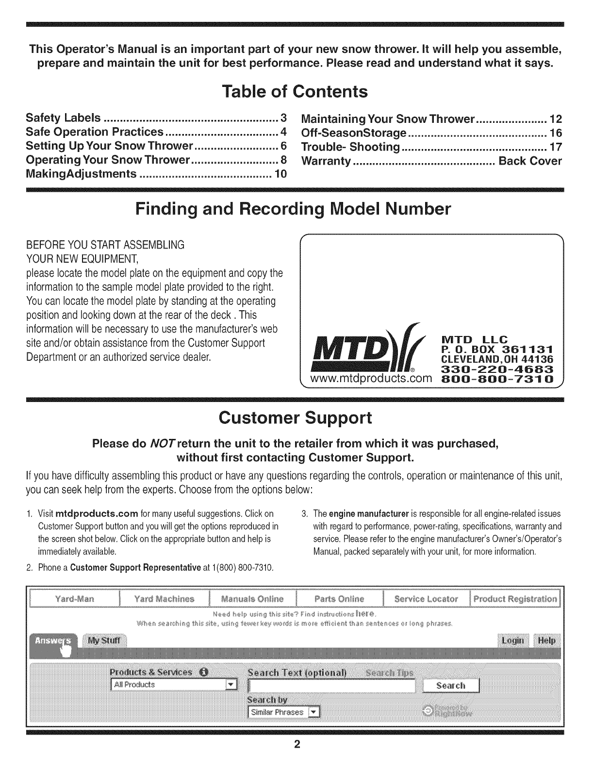 MTD LLC, P.O. BOX 361131 CLEVELAND, OHIO 44136-0019; Phone: 1-800-800-7310, 1-330-220-4683