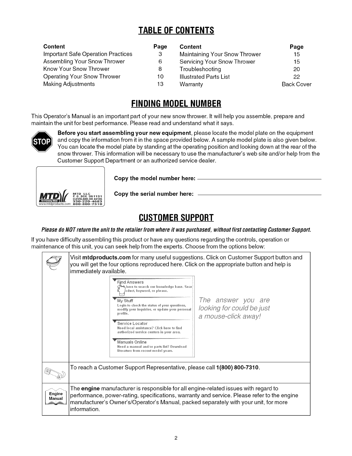 Visit mtdproducts.com for many useful suggestions. Click on Customer Support button and