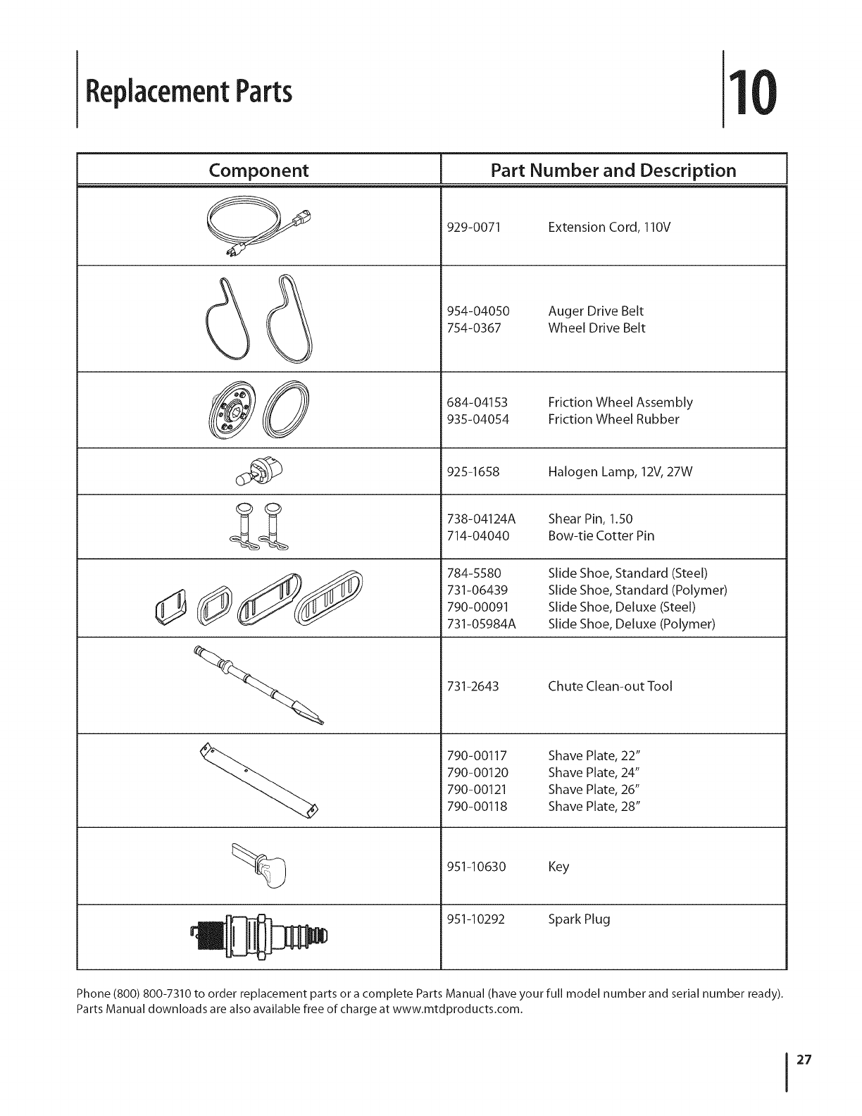 wheels, shave plates, auger spiral rubber, engine oil, air filters, spark