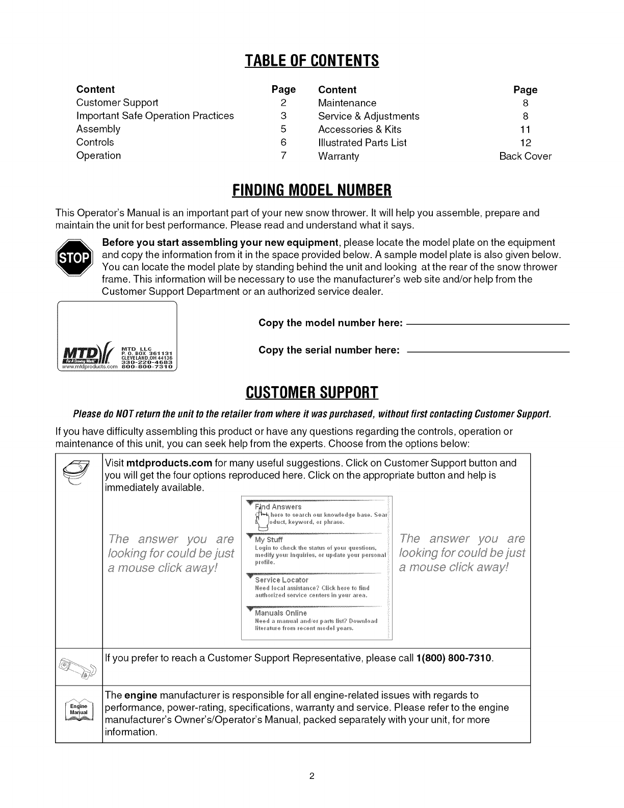 Visit mtdproducts.com for many useful suggestions. Click on Customer Support button and