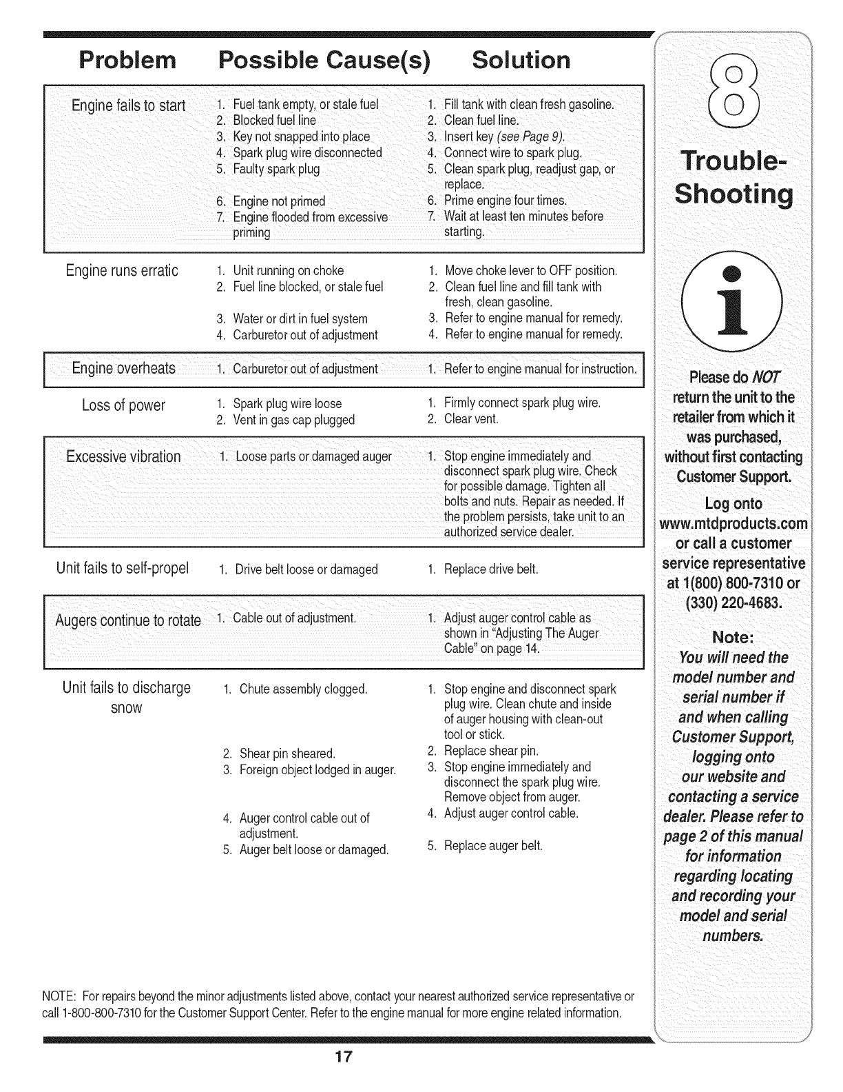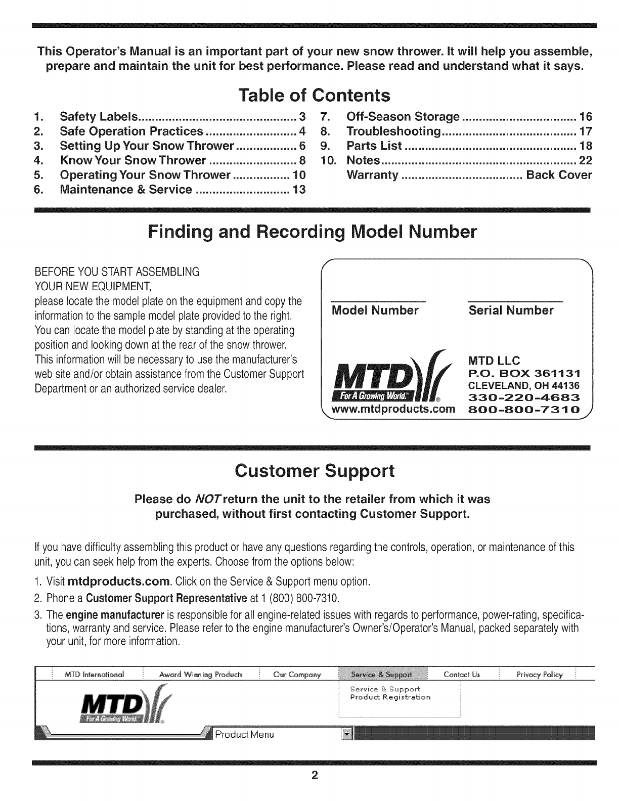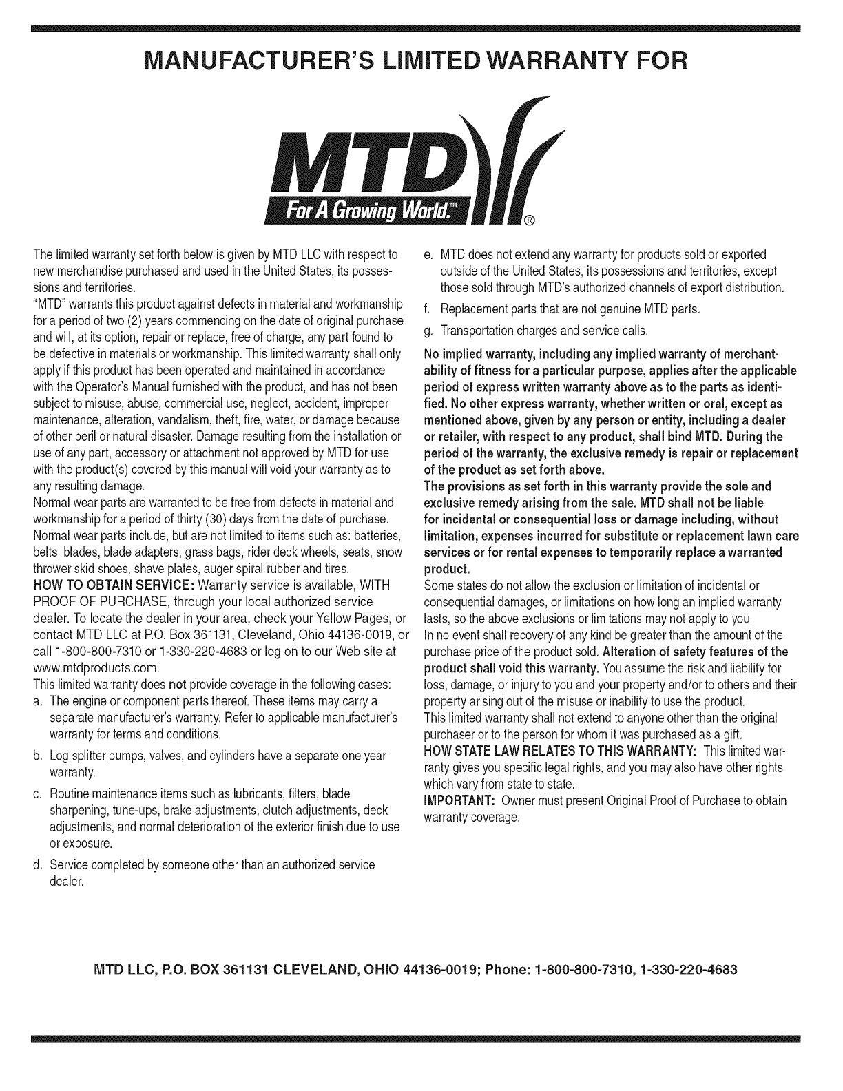 MTD LLC, P.O. BOX 361131 CLEVELAND, OHIO 44136-0019; Phone: 1-800-800-7310, 1-330-220-4683