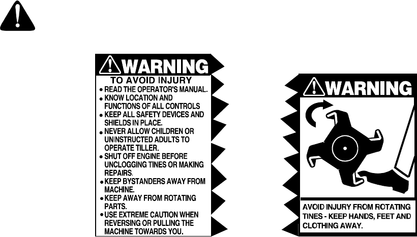 serious injury. This tiller is capable of amputating hands and feet. Failure to observe the following safety