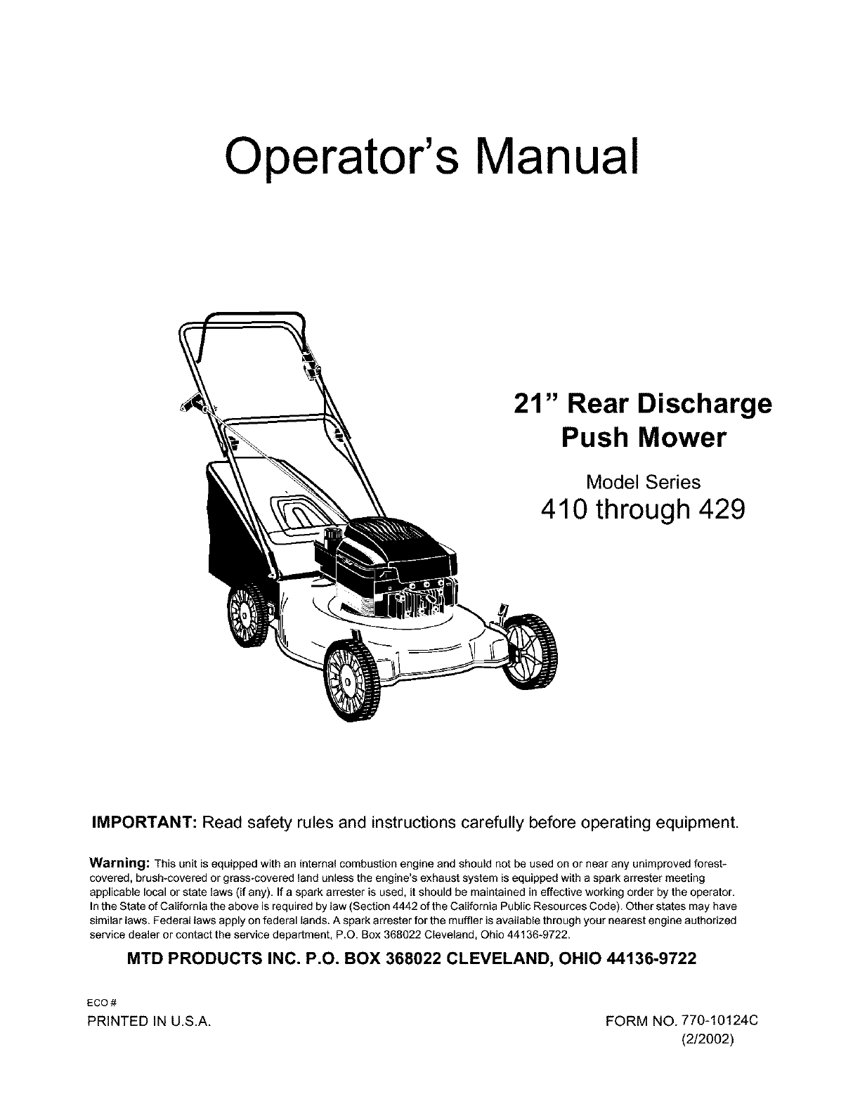 MTD Walk Behind Lawnmower, Gas Manual L0403118