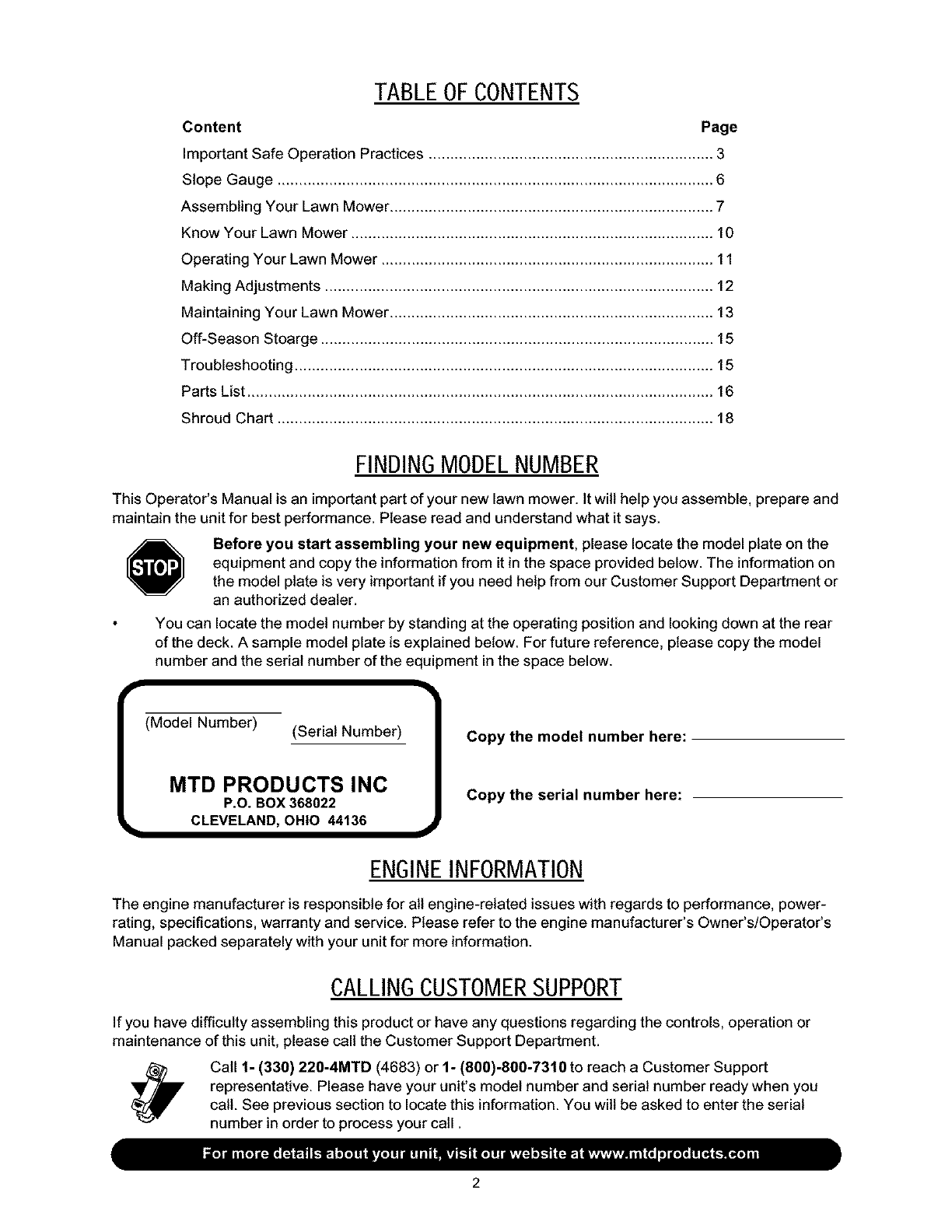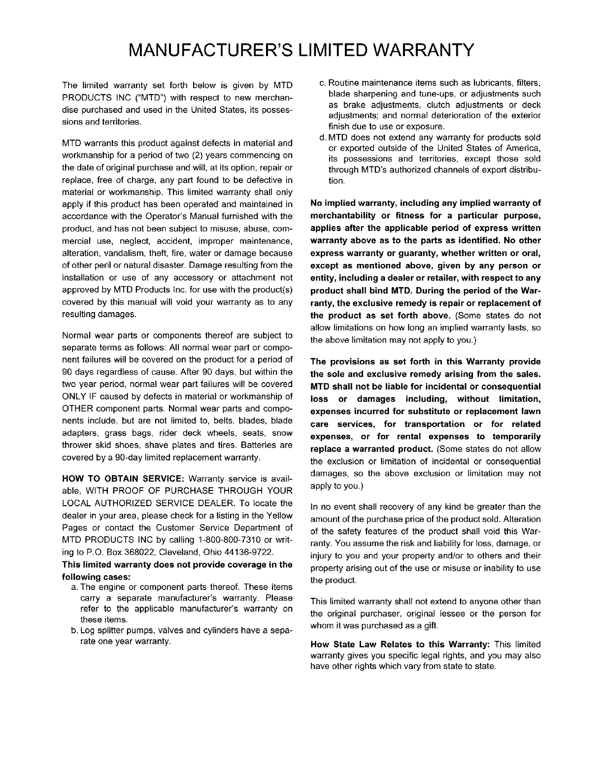 MTD PRODUCTS INC by calling 1-800-800-7310 or writ-