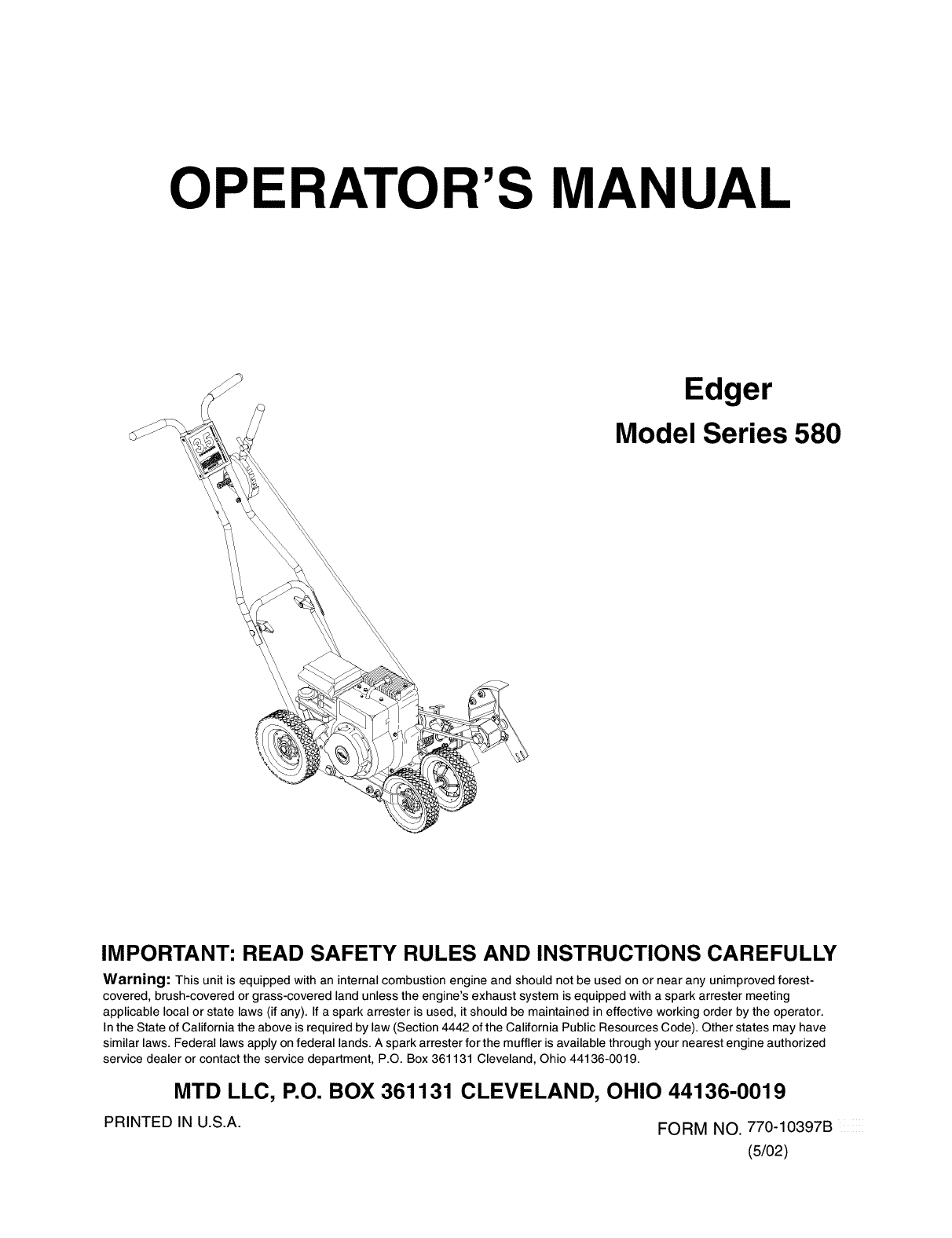 MTD LLC, P.O. BOX 361131 CLEVELAND, OHIO 44136-0019 1-800-800-7310