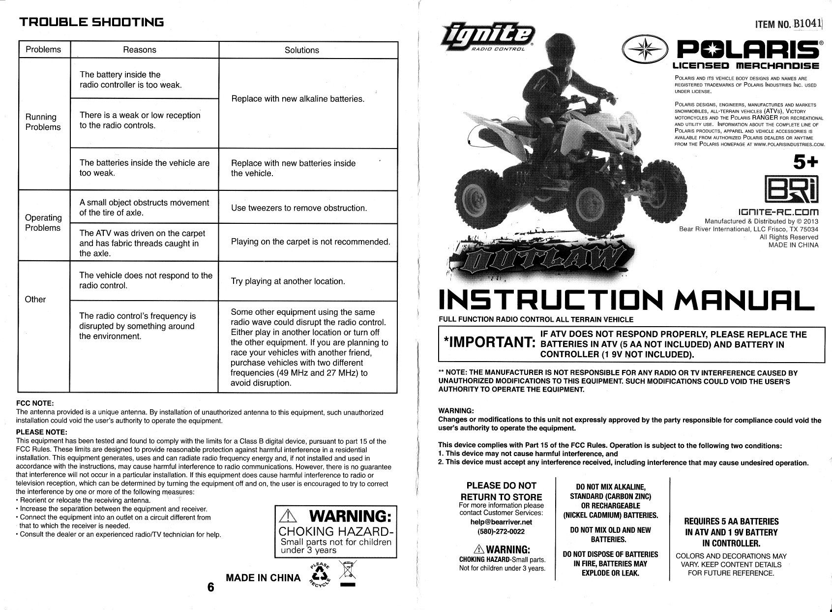 Bear River International LLC 26.96-27.28 MHz WIRELESS REMOTE CONTROL TOY-TX