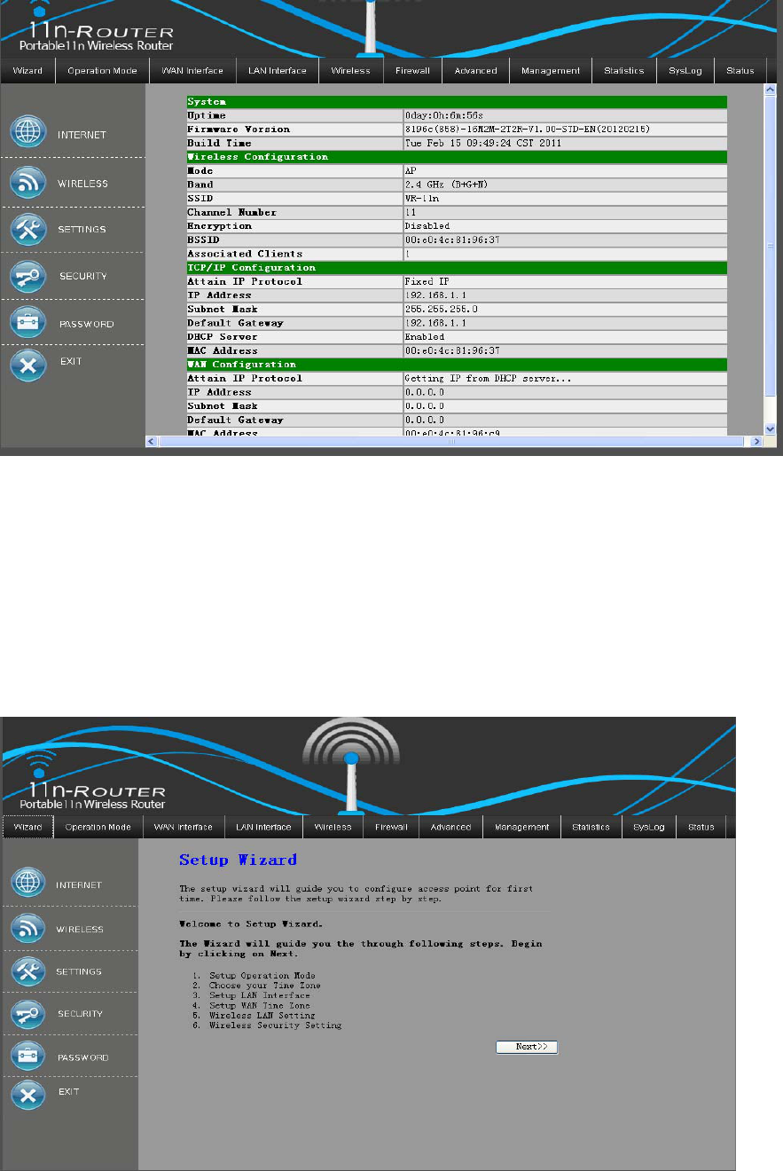The seven main menus are: Setup Wizard,Operation Mode,Wireless,TCP/IP