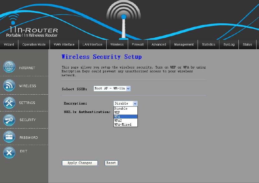 Select Wireless---->Wireless Security Setup,get into the wireless security setup