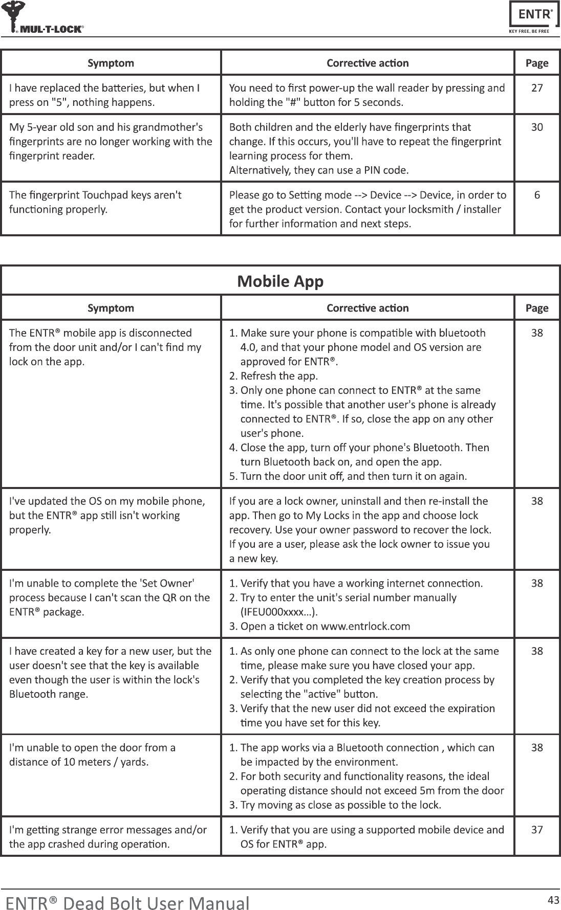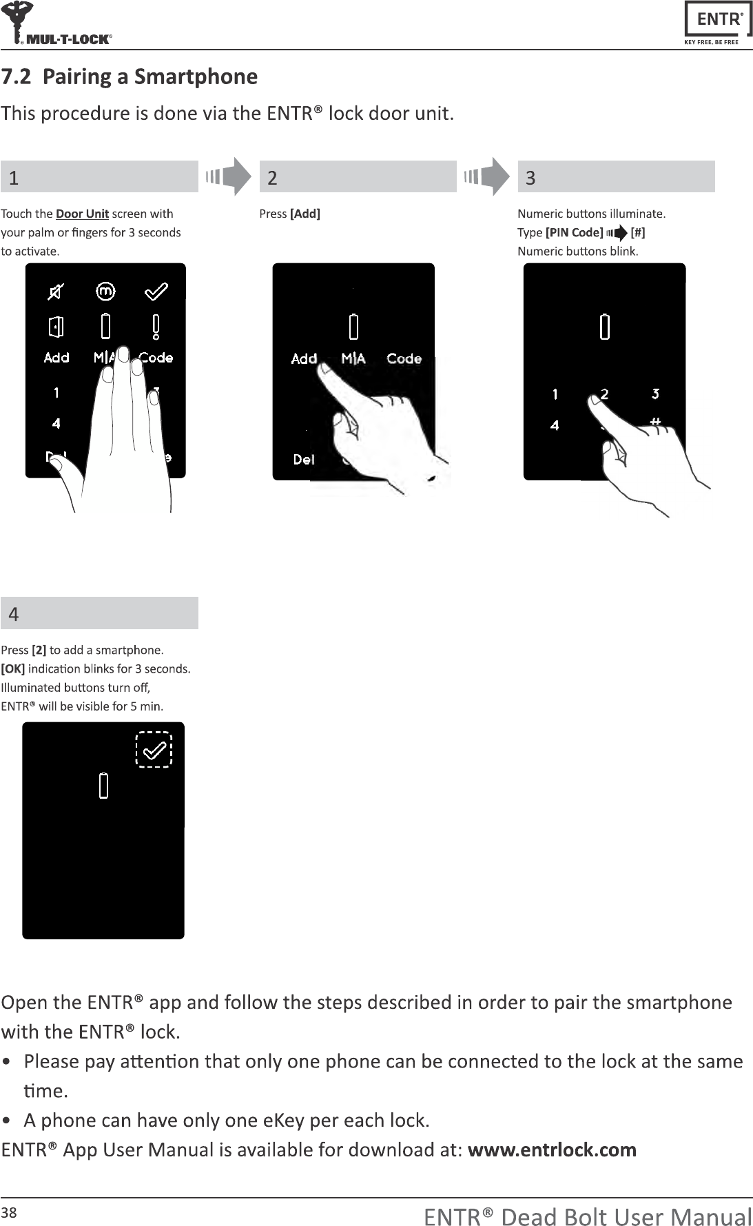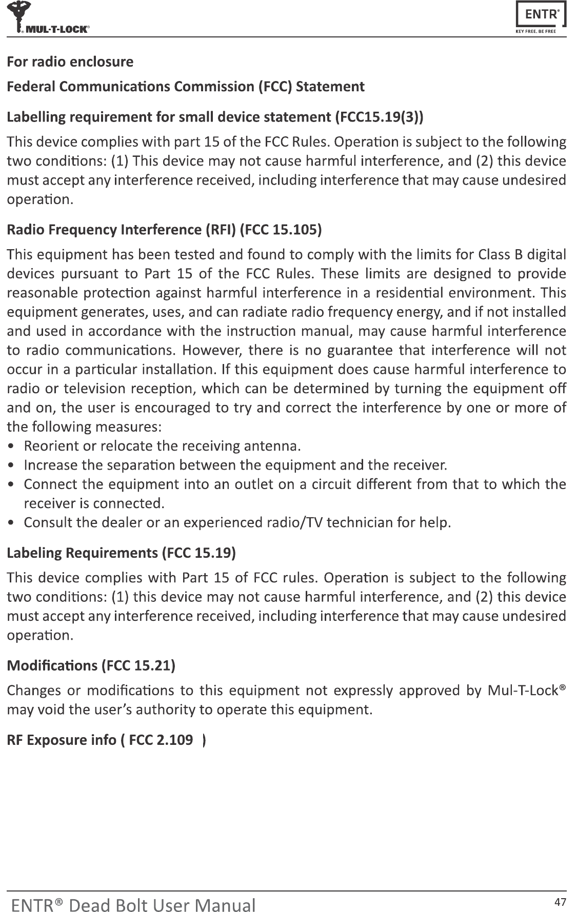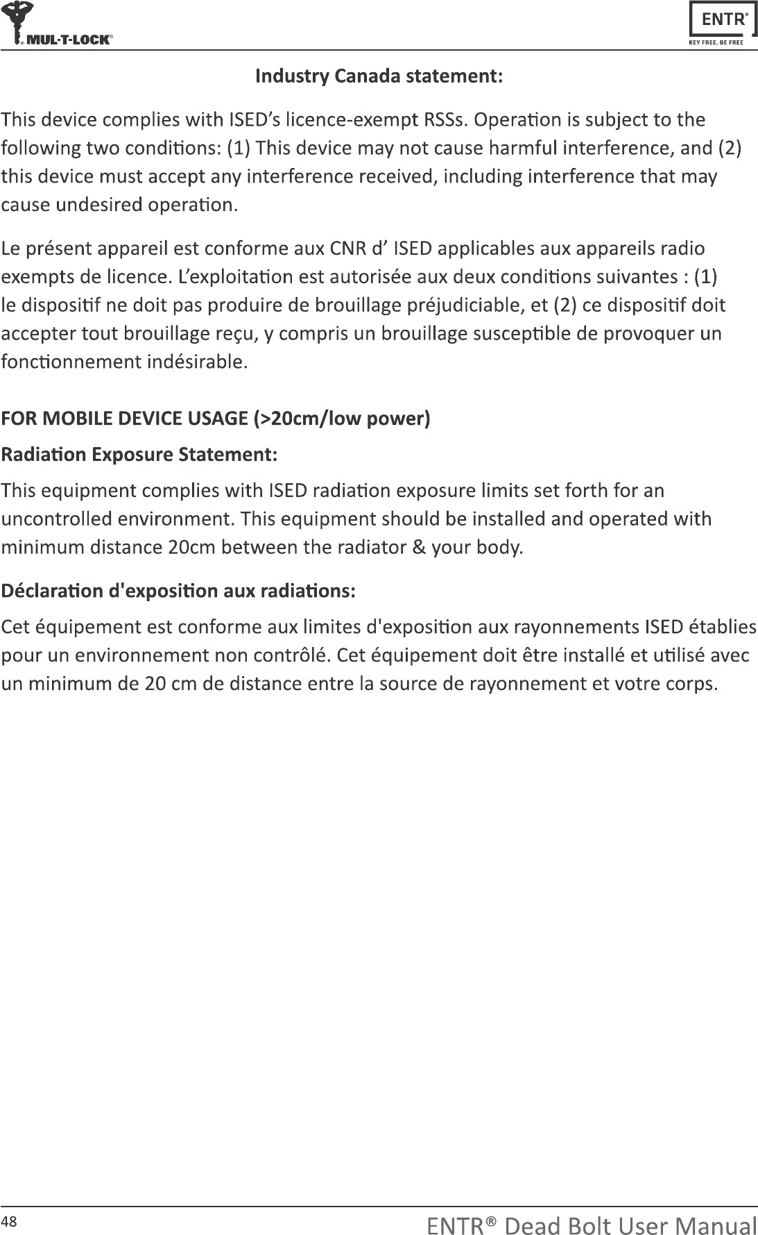 MUL T LOCK TECHNOLOGIES ENTRWRF00 ENTR Fingerprint Reader User Manual ENTRR Fingerprint Reader FCC IC