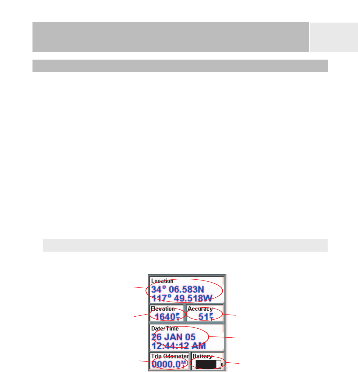 Position Includes position, elevation, accuracy, date and time, trip odometer,