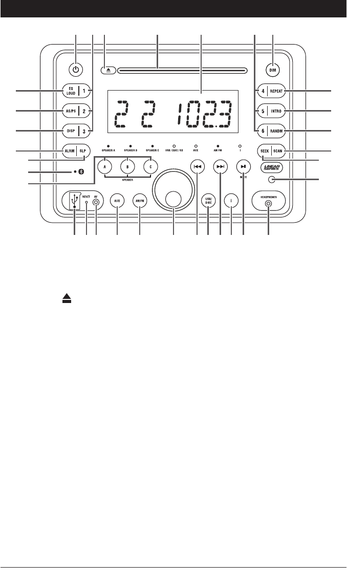 Display Area: This area displays all function information for the radio, clock, disc player and auxiliary