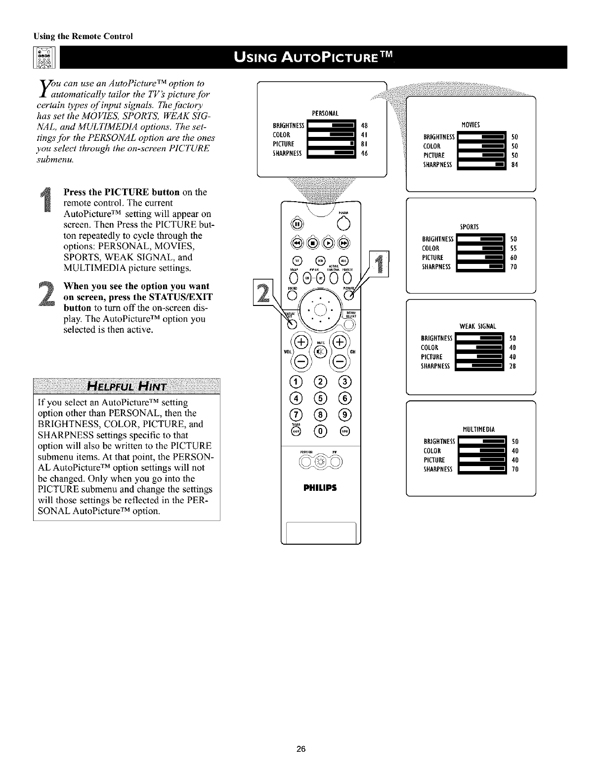 NOTE: Allow the TV to warm up.[br 20 minutes be[bre using Auto