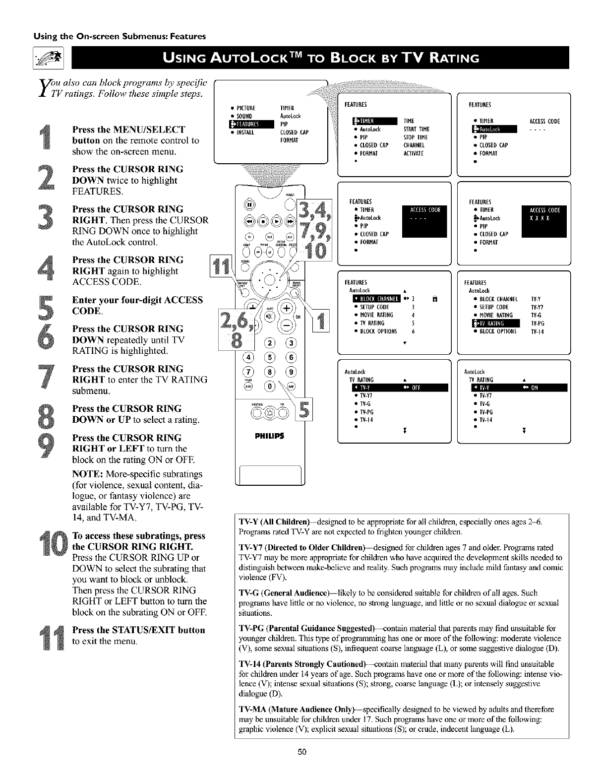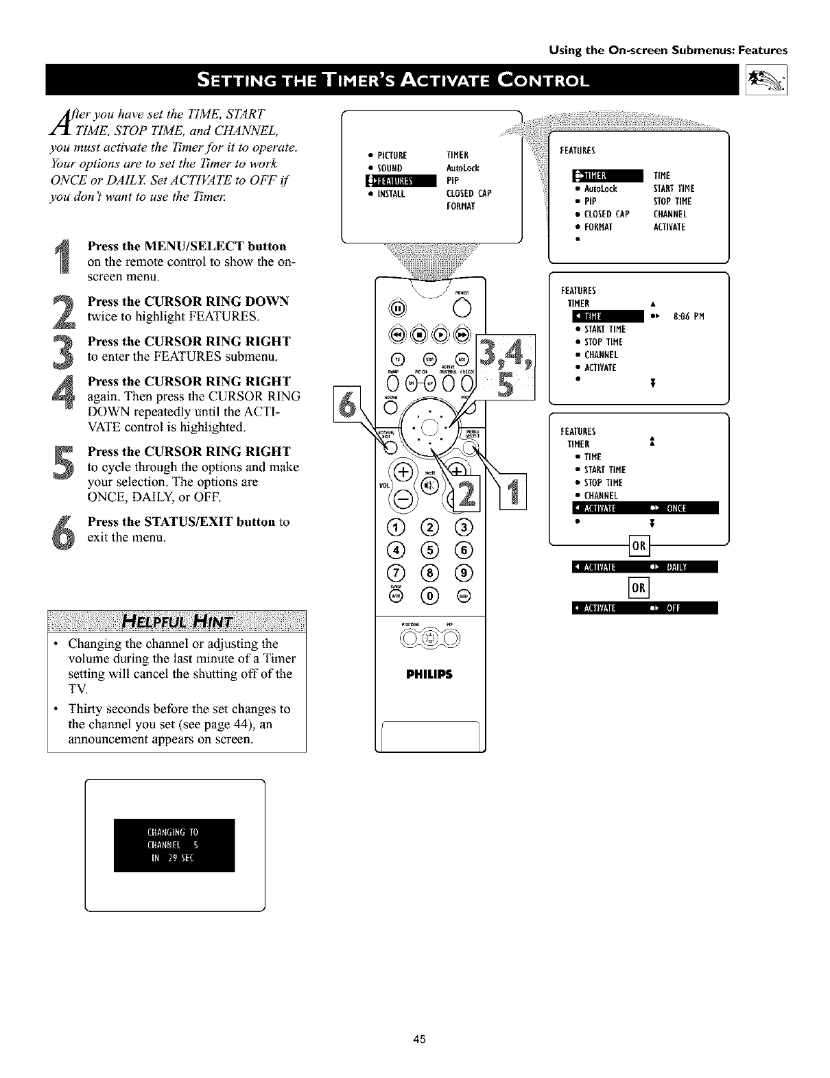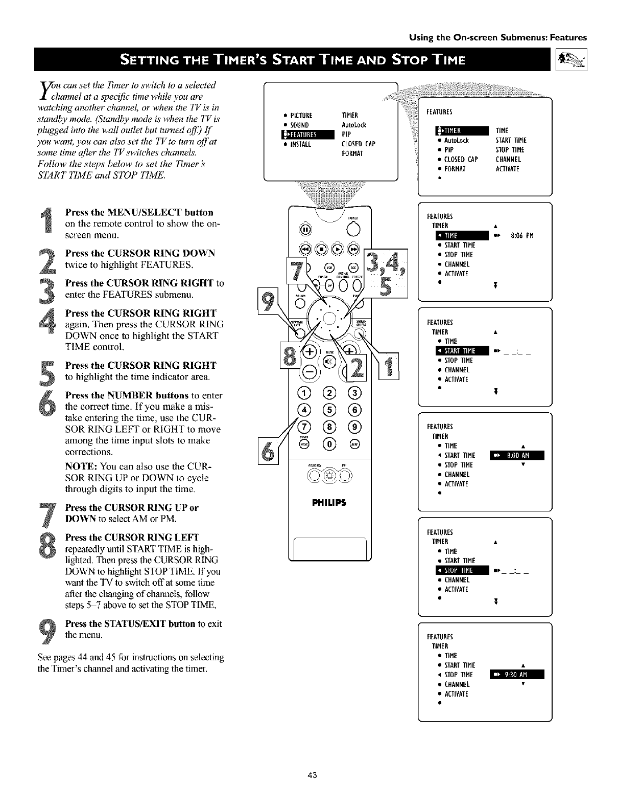 TURES submenu. Then press the CURSOR RING DOWN