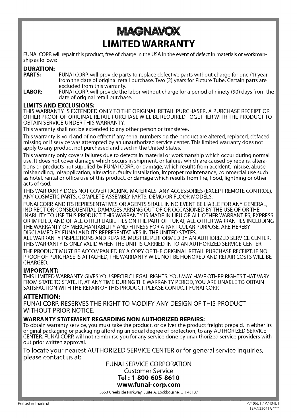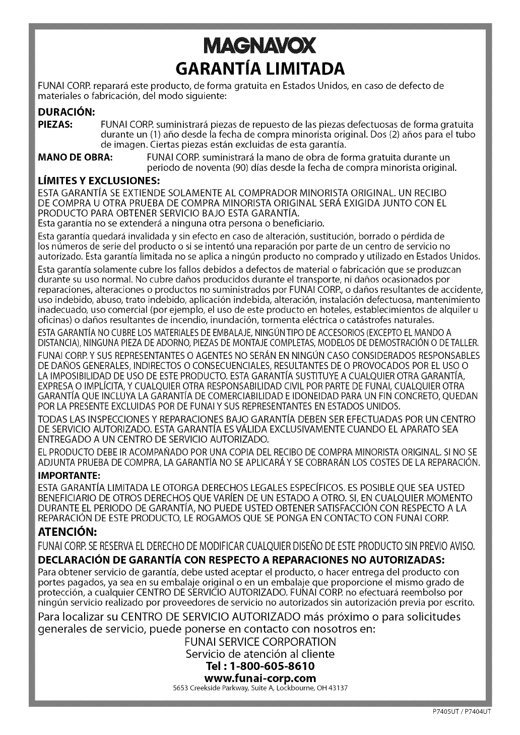 FUNAI CORR reparar_ este producto, de forma gratuita en Estados Unidos, en caso de defecto de