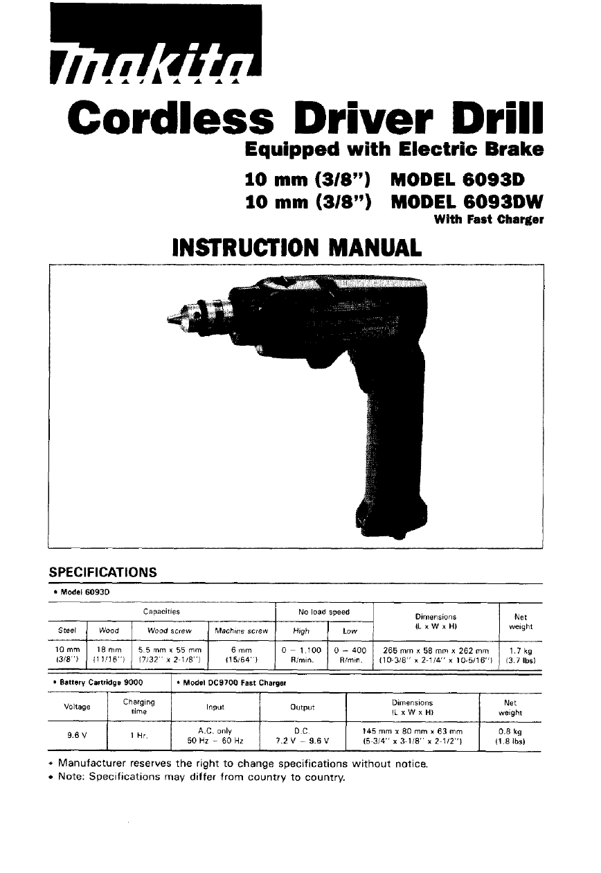 User Manual: Makita 6093D 6093D MAKITA DRIVER DRILL - Manuals and Guides View the owners manual for your MAKITA DRIVER DRILL #6093D. Home:Tool Parts:Makita Parts:Makita DRIVER DRILL Manual