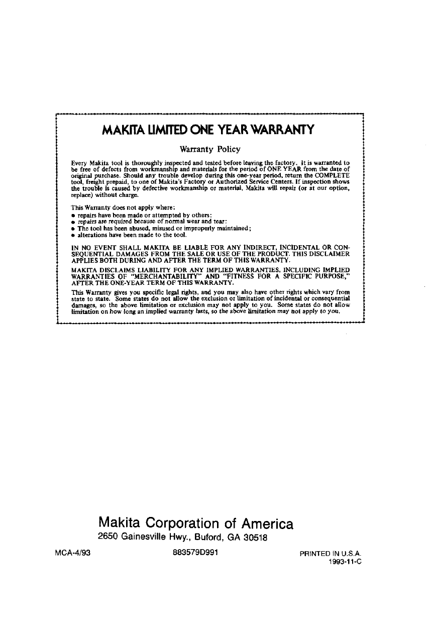 MAKITA LIMITEDONE YEARWARRANTY