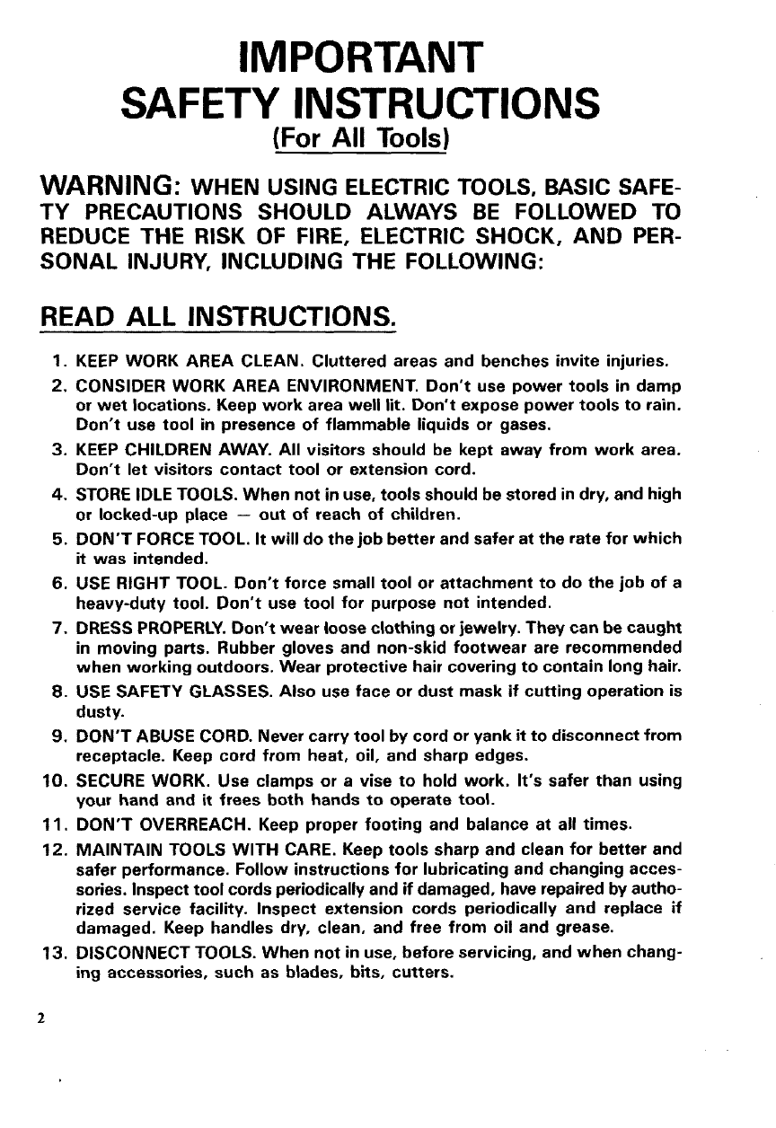 WARNING: WHEN USING ELECTRIC TOOLS, BASIC SAFE-