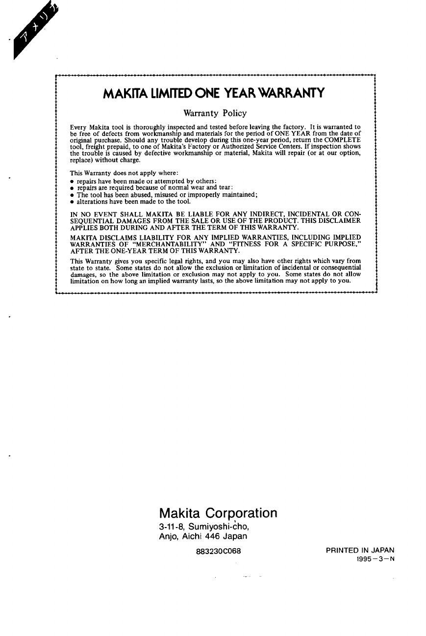 MAKITA DISCLAIMS LIABILITY FOR ANY IMPLIED WARRANTIES, INCLUDING IMPLIED
