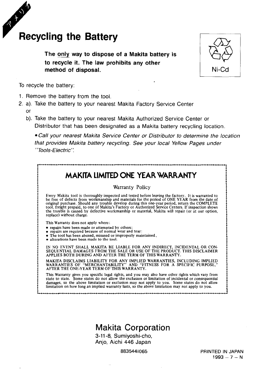 MAKITA DISCLAIMS LIABILITY FOR ANY IMPLIED WARRANTIES, INCLUDING IMPLIED