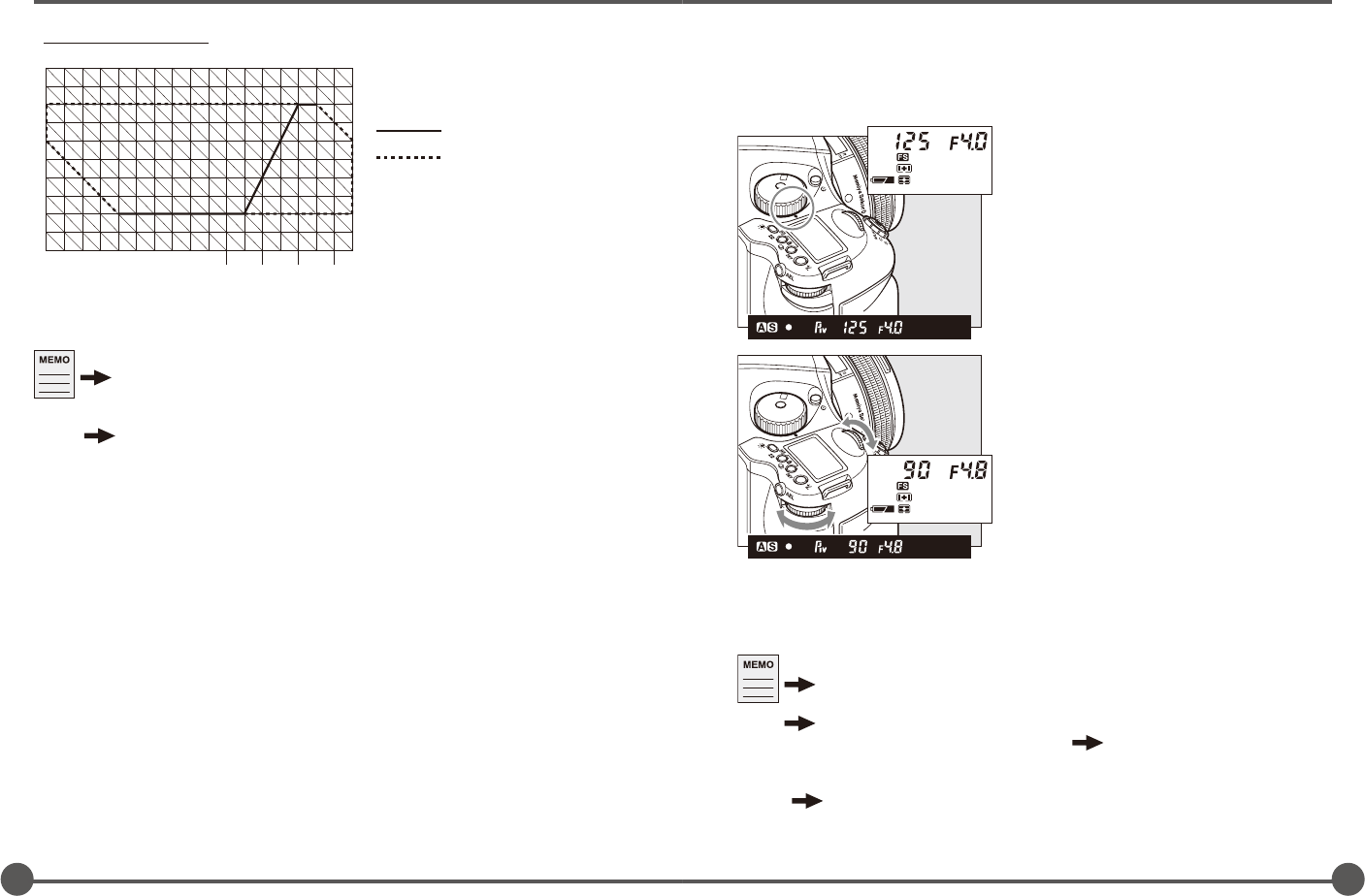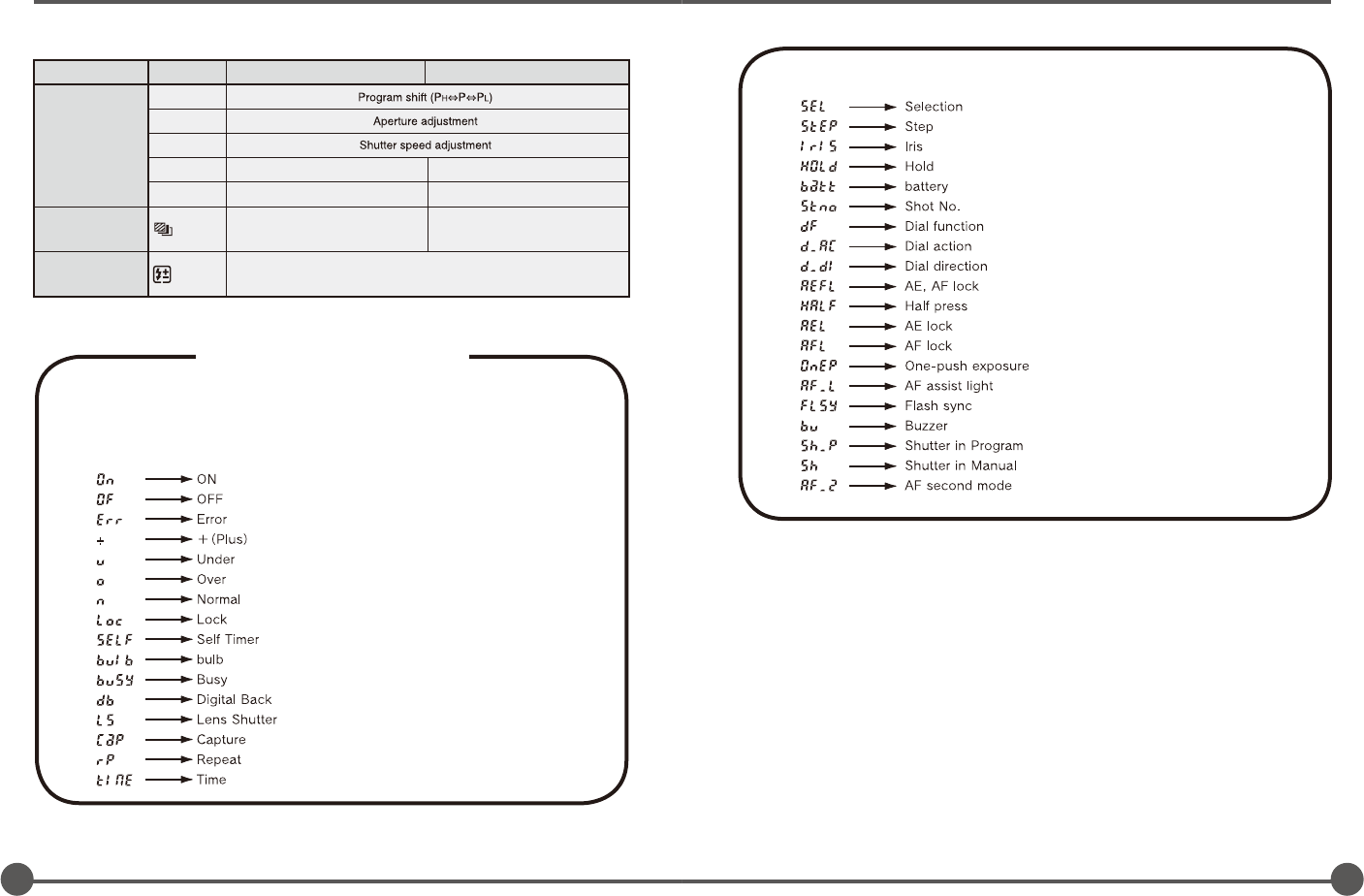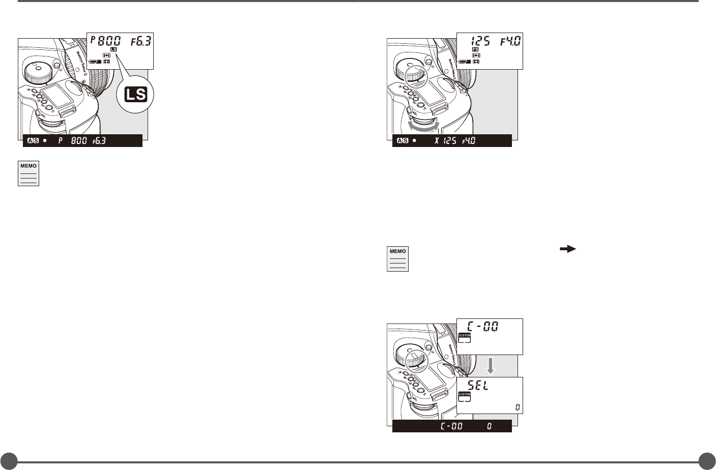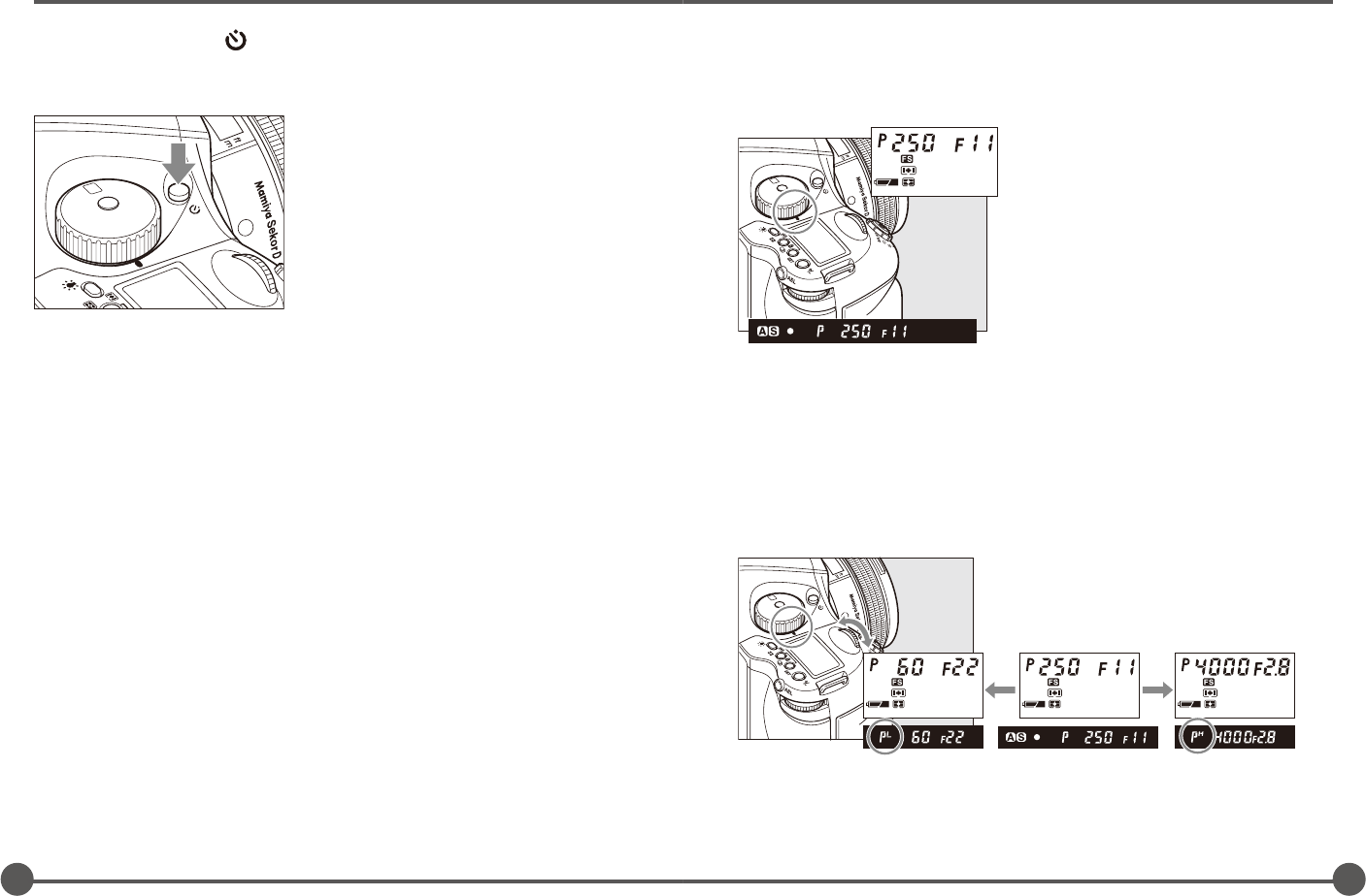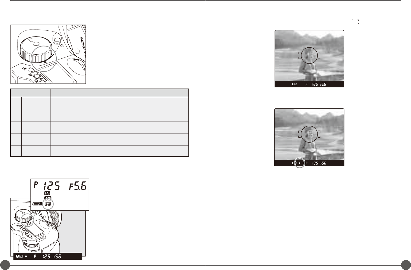 LCD displays : Program AE mode icon, synchro mode icon, shutter speed, aperture,