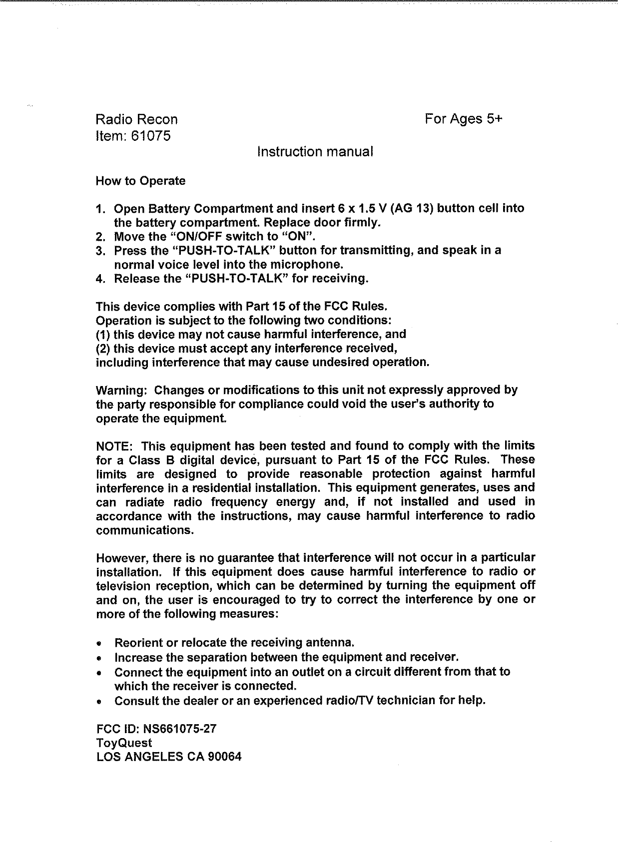Manley Toys 61075-27 Toy Walkie Talkie User Manual