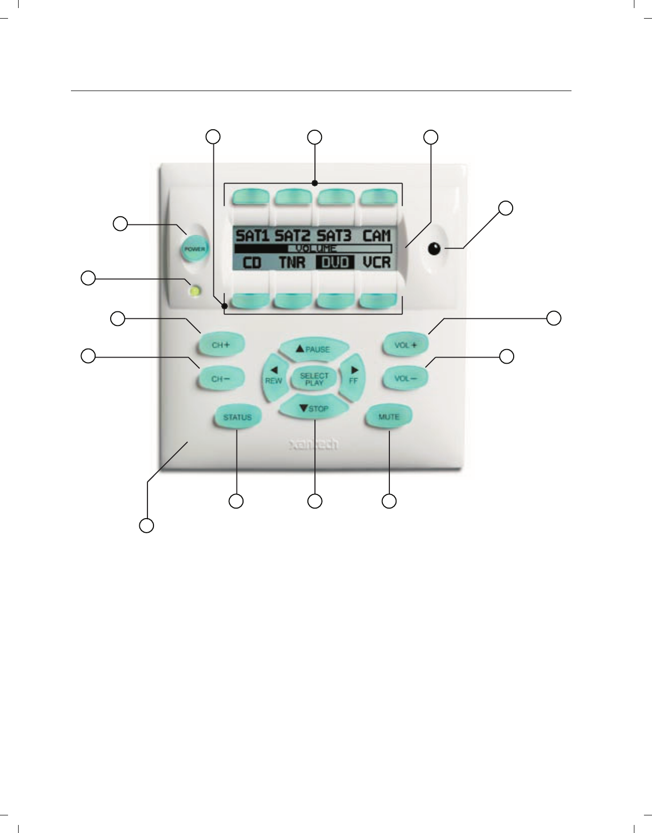 14. Select/Play, Stop, Pause, Rew, FF. Each send IR commands programmed to these buttons to the